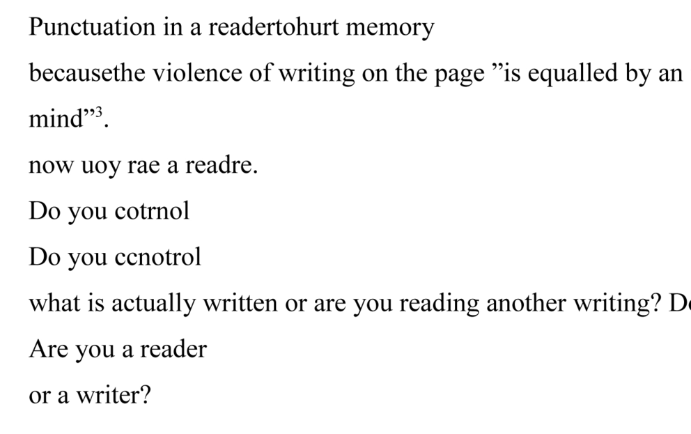 The work puts the relationship between the writer and the reader as well as reader and text into play, by addressing the act of silent reading as it takes place within the body as well as mind of the reader. By explicitly addressing the reader and the performance of reading, it unveils the circulation of submission and power, violence and vulnerability that is part of language and it’s manifestation in the relation between reader, text and writer.