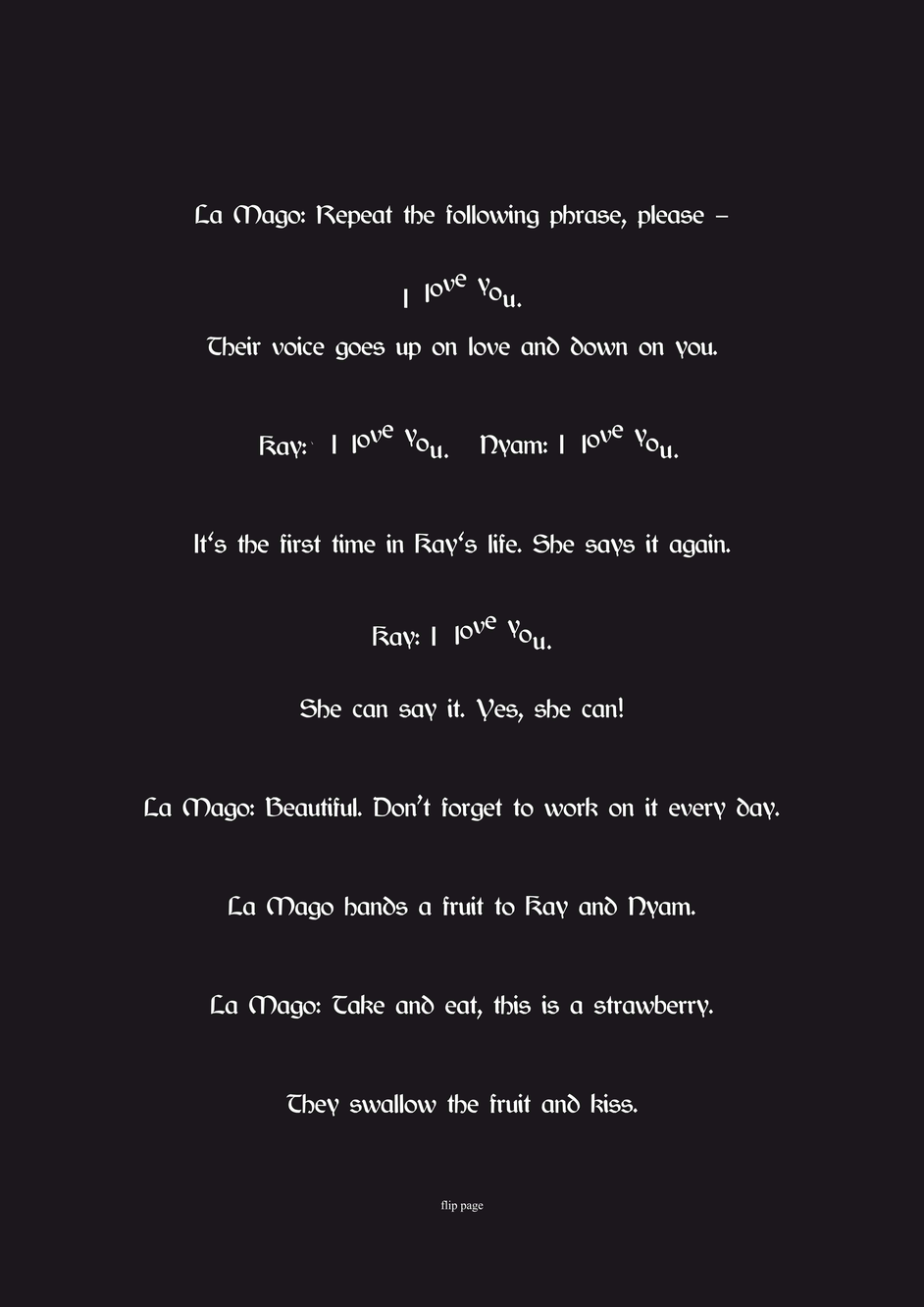 My works often depart from interviews, dialogues or conversation games that unfold over a long time and across different mediums. Lived experience can turn into text, into a transcript, into a prompt, into lived experience again... Recently, I have taken this approach further by inviting scientists and artists to actively participate in a fiction of mine. The black page above (2.) depicts a scene from a novel that I’m currently writing: Kay, the female protagonist, marries Nyam, a character described as half-man, half-foam. The marriage ritual itself consists of a sung-spoken love declaration instructed by a priest called La Mago. The figure of La Mago was initially inspired by a friend of mine. Later I invited this friend, the performing artist and witch doctor [M] Dudeck, to comment on the marriage scene. Furthermore, I asked them to adopt the role of a fictional expert of my novel, while I, the actual author, tried to speak as an interviewer. Over several months we engaged in a strange archeology of our own lives, exploring the relations between love and language, religion and speech acts of make-belief. Whilst we were moving in and out of our selves the borders between primary literature and comment, between author and editor became blurry, opening up other positionalities and forms of beings. If you click on the image (2.) and scroll to the right, you find a fictocritical text which has resulted from our dialogue.