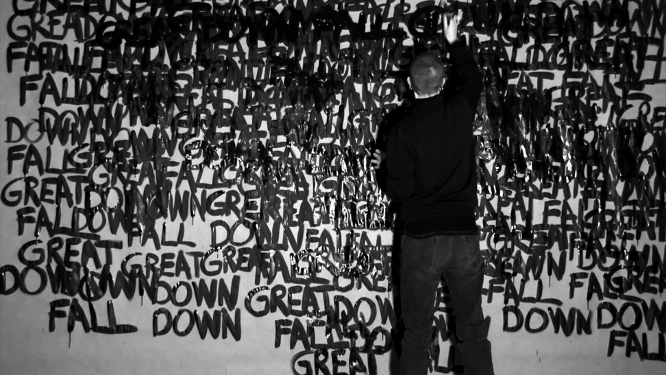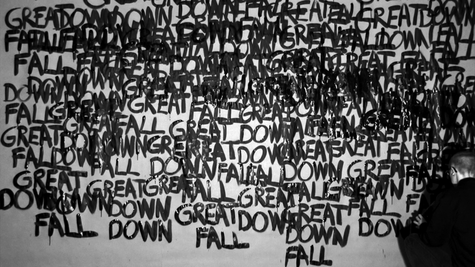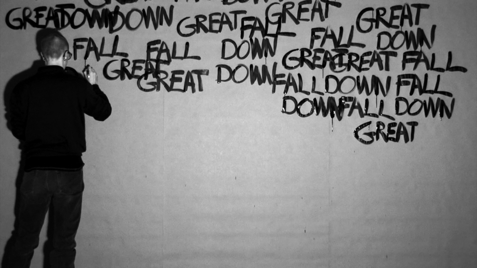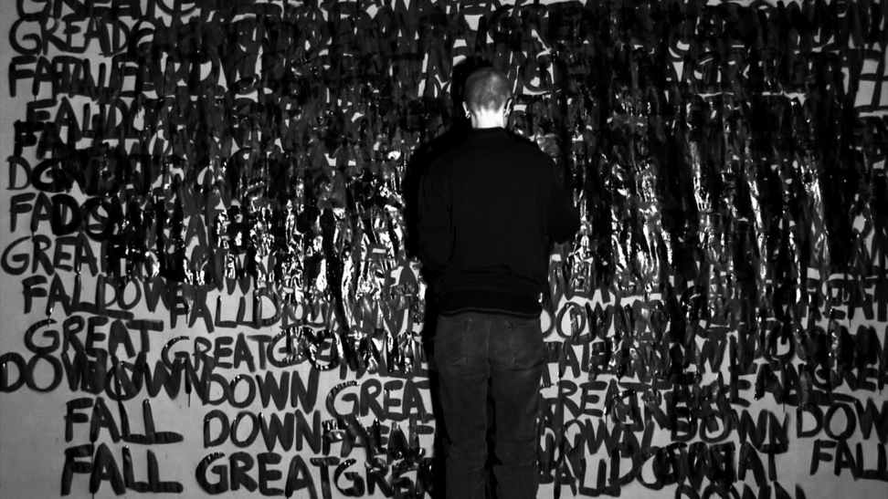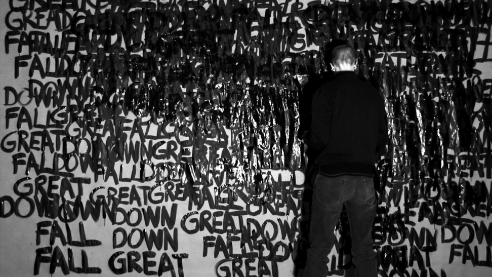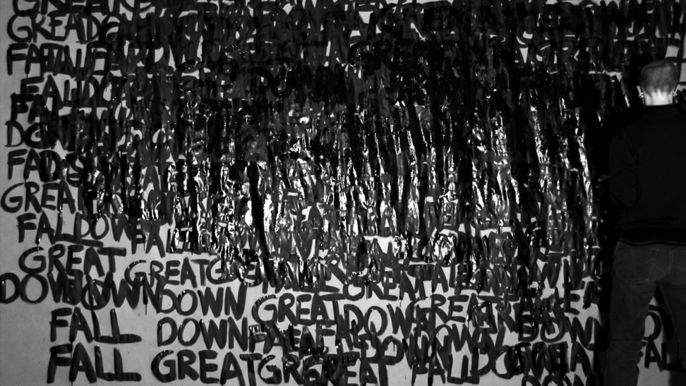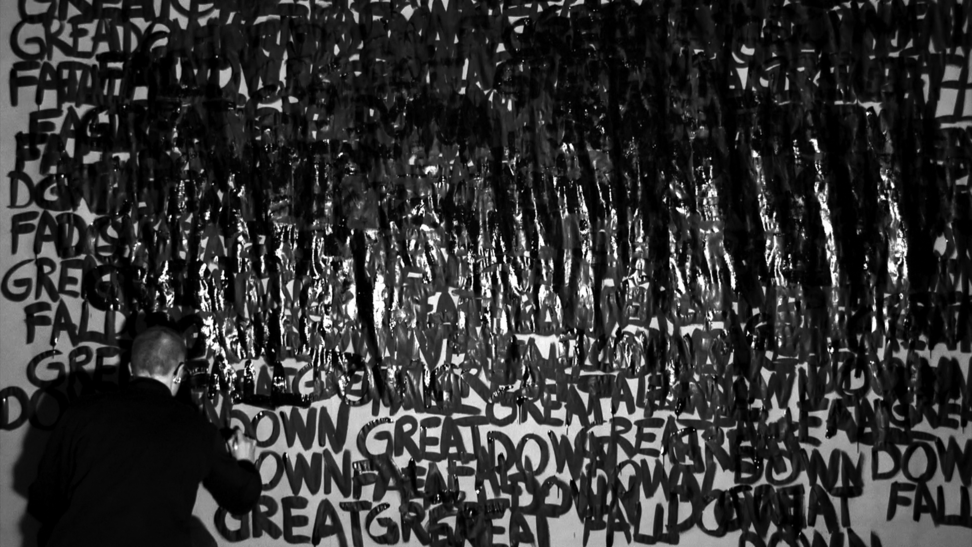 This work came about in a more direct and intuitive process. Those three words stuck in my head and they started to repeat themselves, over and over, and they did not go away. I decided to write the words down, over and over, in the same order; GREAT DOWN FALL. I was doing this for an hour, and along the way the words were written above each other and dissolved into the black surface. As a reader, after a while, you are able to read the words in a new order, depending on how they are written and where you lay your eyes, and then the content and meaning might slide a bit. 2014 was somehow a breakage point in Swedish politics, where the centre grew towards the right, and now in 2020 I see this work somehow again connect to the contemporary political landscape. 3wordpoem is a one-hour video documentation without sound and looped. Here you see 24 stills from that documentation.