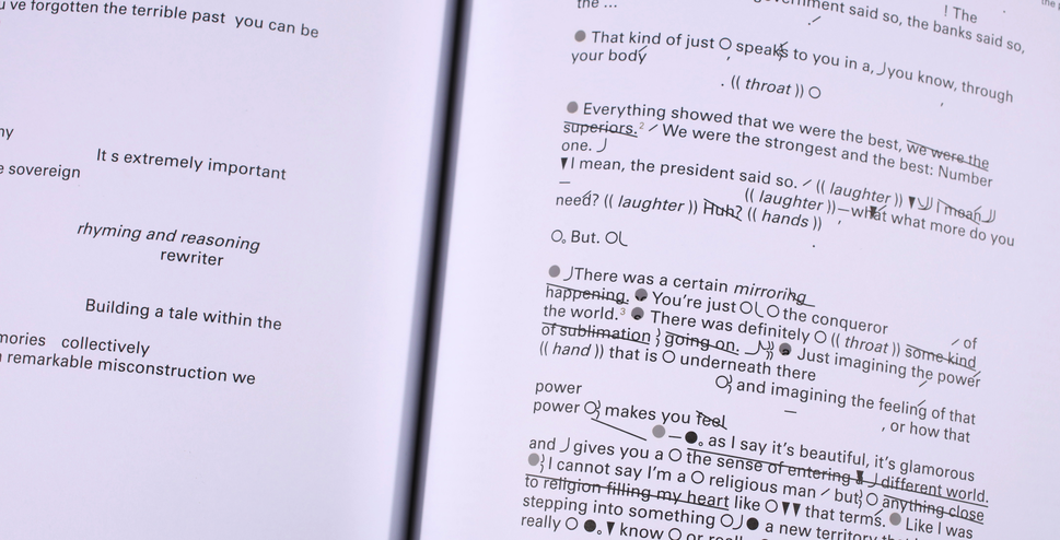 I draw from an exhaustive practice of multiple interviews and close listening. Recorded conversations and their transcription are a process of research as well as a material and medium. As I transcribe, I listen for recurring motifs which become my subjects. I listen also to the voice, its inflections, its figures of speech. From here, I ‘write’ through other people’s voices and invent notation systems for scoring the unspoken. I aim, inter alia, to disorientate and enliven habitual modes of reading and listening.