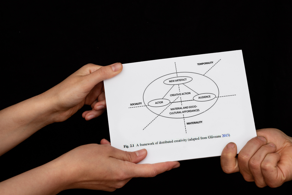 I have chosen to directly quote the diagrammatic parts of published creativity research (like Distributed Creativity: Thinking Outside the Box of the Creative Individual Book by Vlad P. Glăveanu and The Palgrave Handbook of Social Creativity Research) in a correspondingly visual way. And yet isn't artistic research itself considered diagrammatic in quality precisely because it too aims to access the iconic level of language so as to understand concepts in a more scientific way? What does it take for creativity research to be creative? I have chosen to not only take a step back and visually recontextualize the diagrams as transmissions or transactions but also in the same breath efface the changing of hands. Even though it is said that truth (if there is such a thing) only exists in being relayed in dialogue, for all we know the two hands belong to the same body.