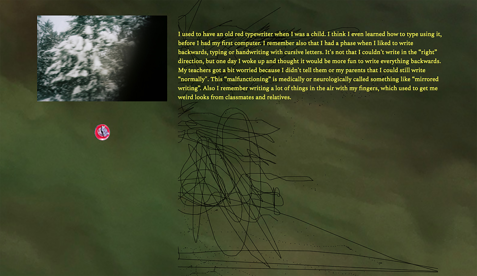 My practice explores an approach that attunes to complexity, against any linear, causal and representational status of language. It thereby resists words and works to be closed in order for them to have a way to enter into the world. Experience does not start and end with finding the right names and narratives, meaning that concepts and moments of experience that stay unnamed or are unaccounted for are completely part of the reading and writing (and walking and coding and dancing and sleeping and and and). Not everything is found in the form of a word. To explore a writing that lets other thoughts emerge alongside, that opens the text(s) to contamination of other words, other thoughts, other worlds.