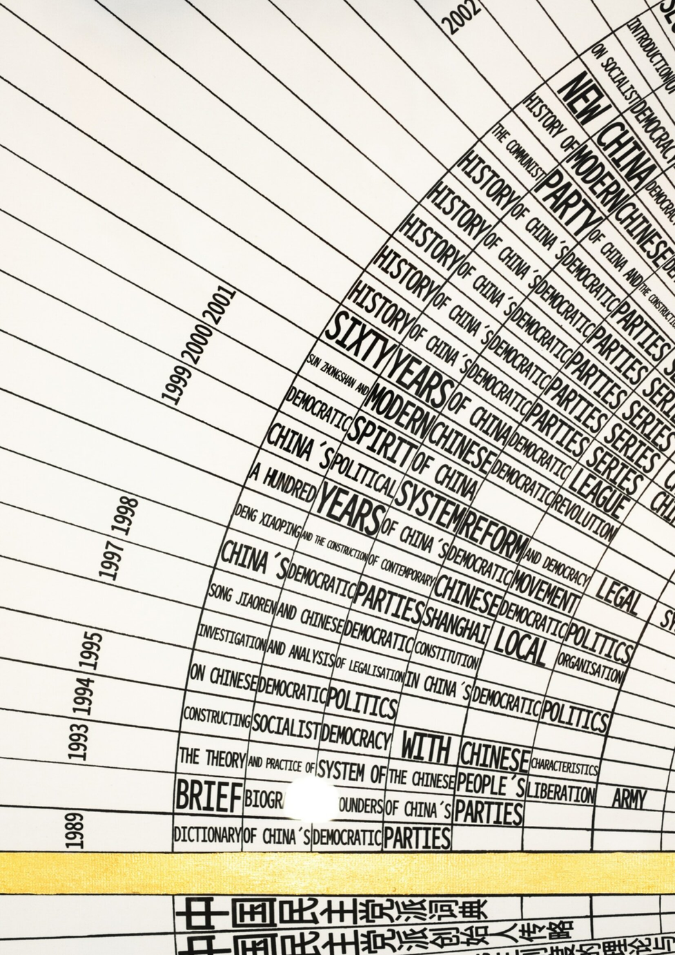 Horizon (2018), a scheme which display all book titles, containing the words democracy and China from 1989 and onward, that are accessible for the public at the National Library of People’s Republic of China in Beijing. The National Library of People’s Republic of China is the largest library in Asia, with a collection of over 35 million items. These 76 book titles found (in September 2018) are arranged in chronologic order, in Mandarin and a mirrored English translation, using the font Noto Sans. This font, belonging to the Noto font family, was commissioned by Google with the goal of achieving visual harmony across multiple languages/scripts. With support by IASPIS, the Swedish Arts Grants Committee's international programme for Visual and Applied Artists.