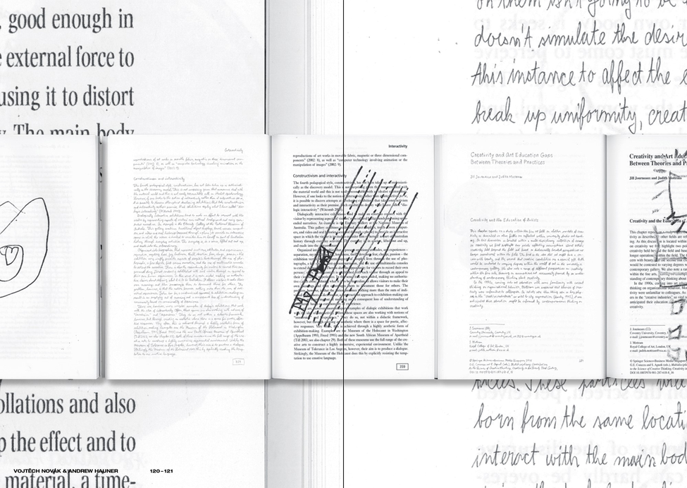 The large-format book Samizdat Contrefaçon recycles and illuminates pages from illegally downloaded and selectively data-mined academic publications whose titles form the cover of the book, a list of bibliographic entries. As is often the case with fakes, what is at stake is rendering accessible the restricted, which in this case is the academic publication in its material or commodity form. In parasitizing otherwise interesting theoretical references, two techniques that view the page as ready-made have been employed: manually transcribing the academic language and using a facsimile of the original page as a backdrop for visuality evocative of creative crisis. Manually transcribing what has already been digitized is a procedure that is anachronic, regressive and above all time-consuming. What has become an aid in counterfeiting e-books is the HD television, used as a lightbox scriptorium table. The drawings created by children, which semantically interact with the pages and yet simultaneously censor them, address contemporary screen-based consumption. Artistic treatment of academic quotation here makes it possible for the academic text to be literate in relational and multiplicative ways.