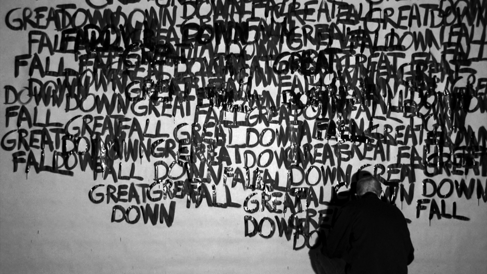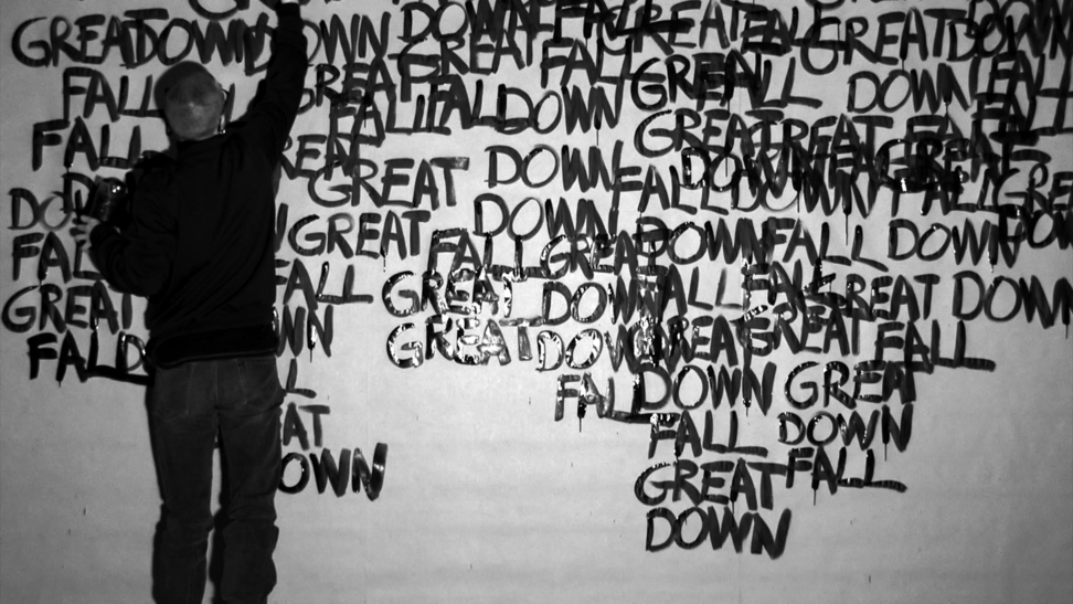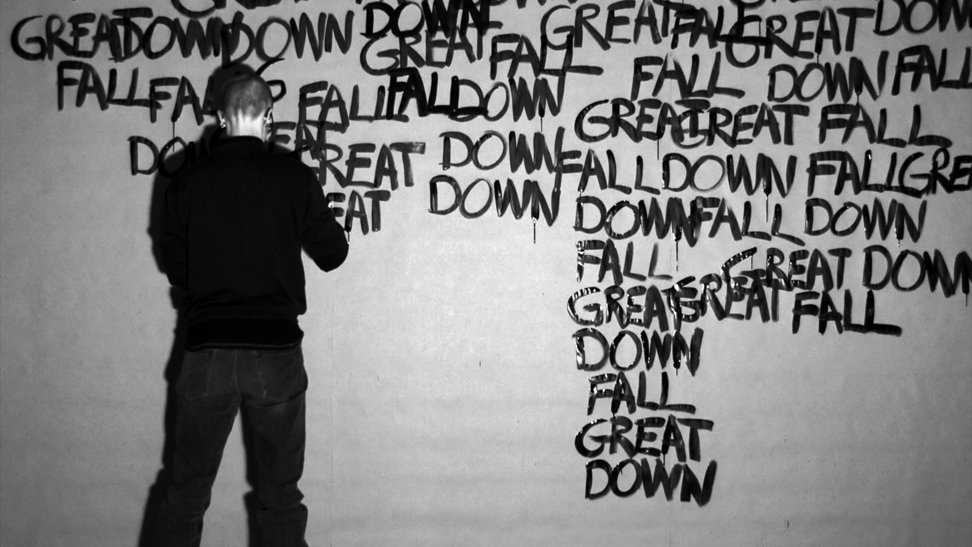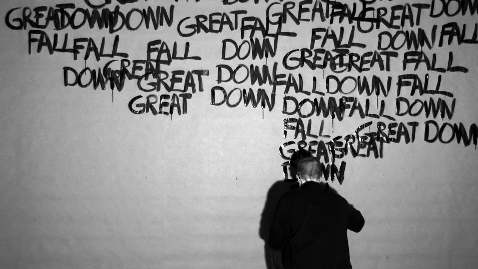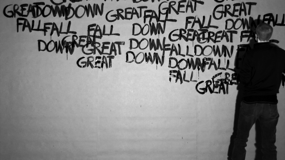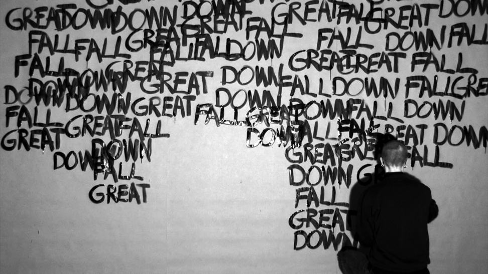 This work came about in a more direct and intuitive process. Those three words stuck in my head and they started to repeat themselves, over and over, and they did not go away. I decided to write the words down, over and over, in the same order; GREAT DOWN FALL. I was doing this for an hour, and along the way the words were written above each other and dissolved into the black surface. As a reader, after a while, you are able to read the words in a new order, depending on how they are written and where you lay your eyes, and then the content and meaning might slide a bit. 2014 was somehow a breakage point in Swedish politics, where the centre grew towards the right, and now in 2020 I see this work somehow again connect to the contemporary political landscape. 3wordpoem is a one-hour video documentation without sound and looped. Here you see 24 stills from that documentation.