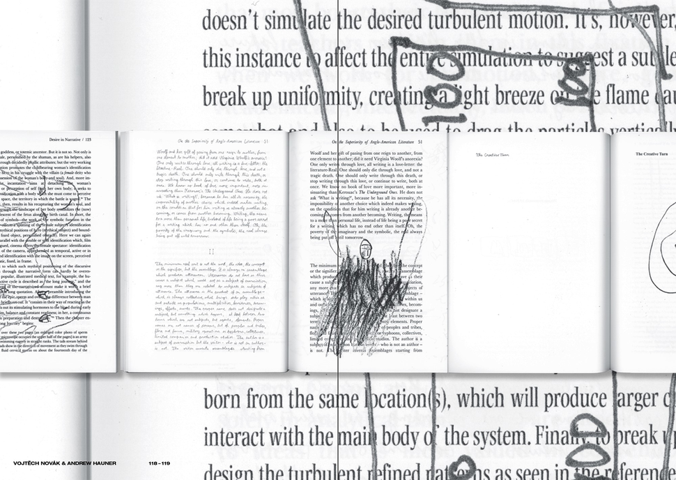 The large-format book Samizdat Contrefaçon recycles and illuminates pages from illegally downloaded and selectively data-mined academic publications whose titles form the cover of the book, a list of bibliographic entries. As is often the case with fakes, what is at stake is rendering accessible the restricted, which in this case is the academic publication in its material or commodity form. In parasitizing otherwise interesting theoretical references, two techniques that view the page as ready-made have been employed: manually transcribing the academic language and using a facsimile of the original page as a backdrop for visuality evocative of creative crisis. Manually transcribing what has already been digitized is a procedure that is anachronic, regressive and above all time-consuming. What has become an aid in counterfeiting e-books is the HD television, used as a lightbox scriptorium table. The drawings created by children, which semantically interact with the pages and yet simultaneously censor them, address contemporary screen-based consumption. Artistic treatment of academic quotation here makes it possible for the academic text to be literate in relational and multiplicative ways.
