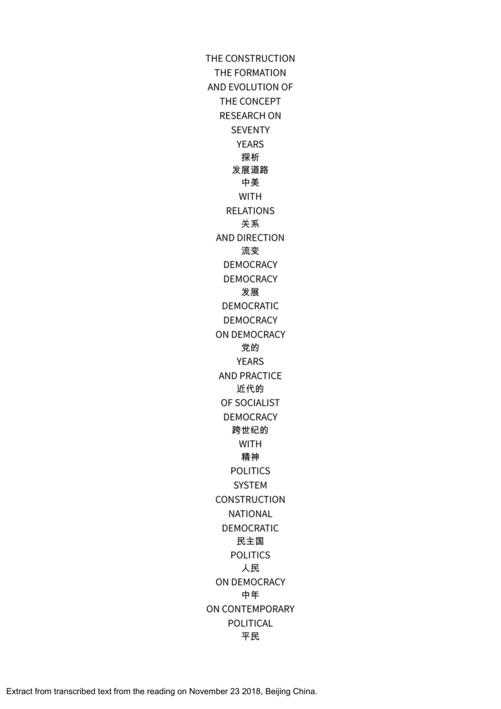 I was invited to carry out a three-month residency at IFP in Beijing during the fall of 2018. I asked myself how I can work within this limited time, in a completely different setting, and with a total lack of language. I came up with a simple question that I brought with me; how many books are there at the National Library in Beijing, with the words China and democracy in the title? To frame it historically I decided to use the 1989 Tiananmen Square massacre as a starting point, still today locally a widely censored topic. I was lucky to meet with artist Dakota Guo, who helped me with research and translation. We found 76 book titles available at the library, starting with the year 1989 till September 2018. I brought the 76 book titles into a diagram that I drew and used the Noto Sans from Google as a digital font. The book titles, in Mandarin and mirrored English translation, created a line or horizon, where I placed a raising/setting sun in gold, the traditional colour of power. To give the diagram a spatial context I built a low table with seating cushions placed around. The tabletop with the diagram under a sheet of glass, almost gives the impression of a board game or such. In an empty gallery space, the table was placed in the middle with the audience gathered around. For 15 minutes Dakota and I did an improvised reading, sitting opposite each other at the table creating a new composition. We read those words our eyes fell upon. Dakota, reading Mandarin, could sit still since the Mandarin layout looks similar to the shape of a fan. To be able to read the full English version I had to move around the table. Dakota understanding both Mandarin and English did sometimes interact with the words I was reading. After 15 minutes the alarm went off.