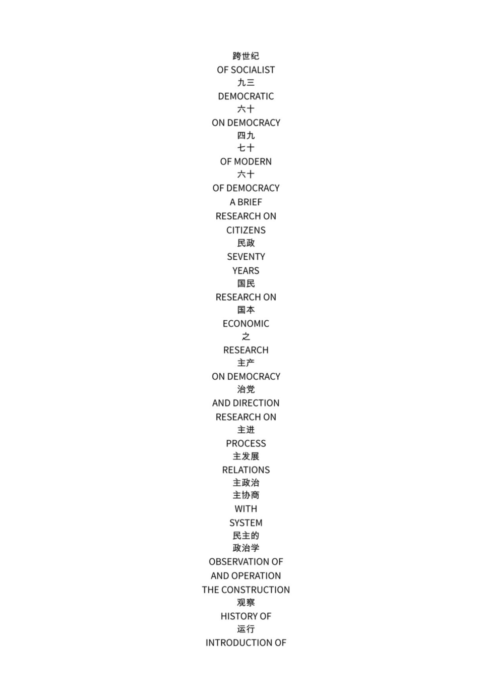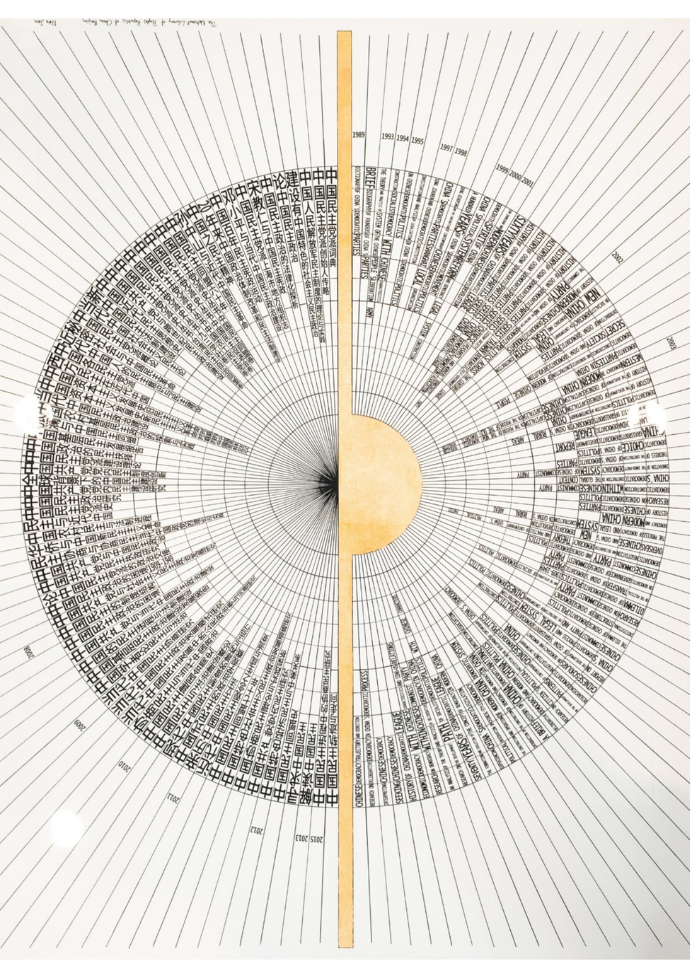 Horizon (2018), a scheme which display all book titles, containing the words democracy and China from 1989 and onward, that are accessible for the public at the National Library of People’s Republic of China in Beijing. The National Library of People’s Republic of China is the largest library in Asia, with a collection of over 35 million items. These 76 book titles found (in September 2018) are arranged in chronologic order, in Mandarin and a mirrored English translation, using the font Noto Sans. This font, belonging to the Noto font family, was commissioned by Google with the goal of achieving visual harmony across multiple languages/scripts. With support by IASPIS, the Swedish Arts Grants Committee's international programme for Visual and Applied Artists.