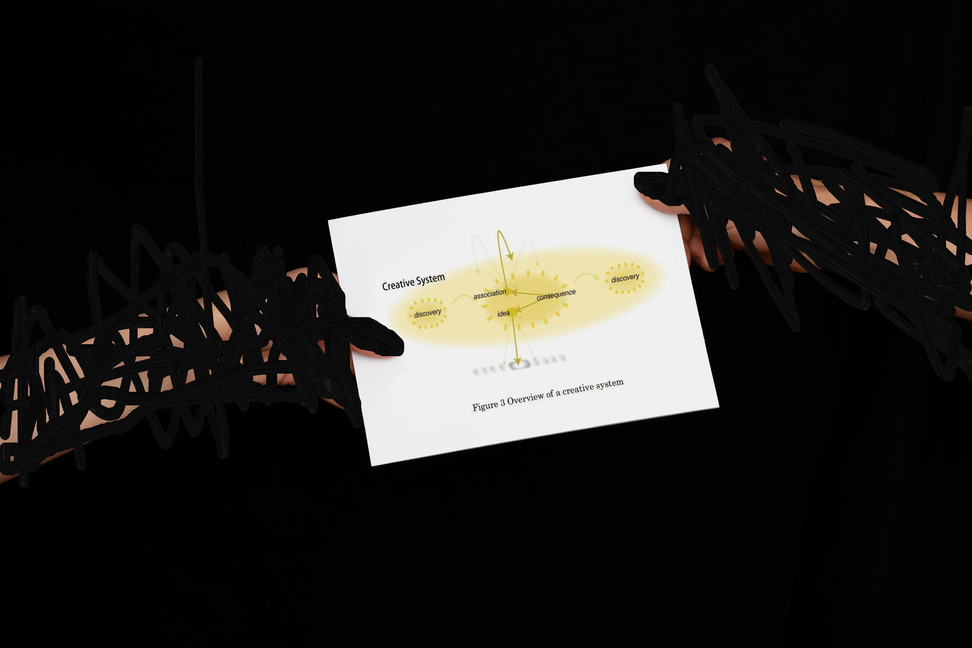 I have chosen to directly quote the diagrammatic parts of published creativity research (like Distributed Creativity: Thinking Outside the Box of the Creative Individual Book by Vlad P. Glăveanu and The Palgrave Handbook of Social Creativity Research) in a correspondingly visual way. And yet isn't artistic research itself considered diagrammatic in quality precisely because it too aims to access the iconic level of language so as to understand concepts in a more scientific way? What does it take for creativity research to be creative? I have chosen to not only take a step back and visually recontextualize the diagrams as transmissions or transactions but also in the same breath efface the changing of hands. Even though it is said that truth (if there is such a thing) only exists in being relayed in dialogue, for all we know the two hands belong to the same body.