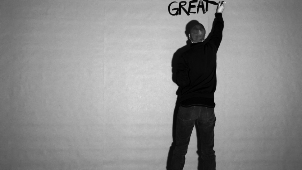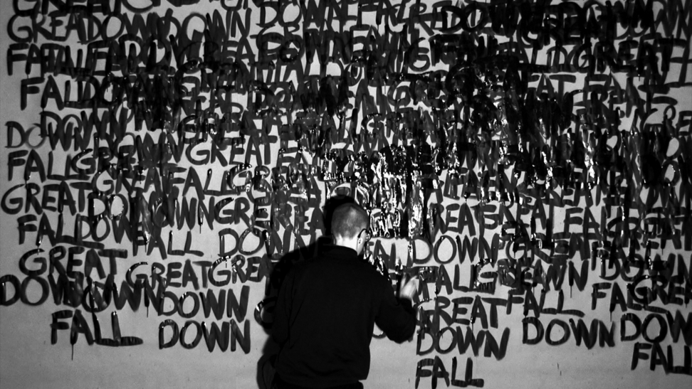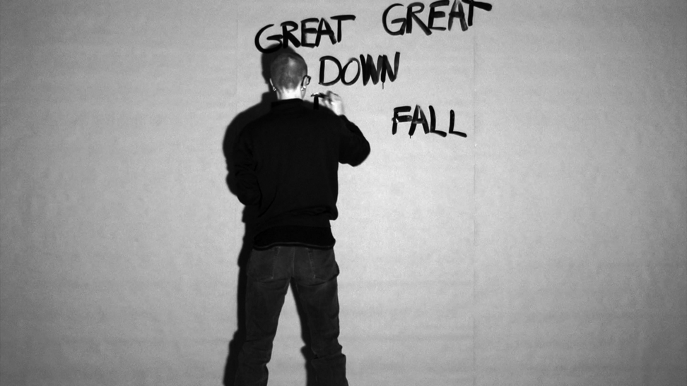 This work came about in a more direct and intuitive process. Those three words stuck in my head and they started to repeat themselves, over and over, and they did not go away. I decided to write the words down, over and over, in the same order; GREAT DOWN FALL. I was doing this for an hour, and along the way the words were written above each other and dissolved into the black surface. As a reader, after a while, you are able to read the words in a new order, depending on how they are written and where you lay your eyes, and then the content and meaning might slide a bit. 2014 was somehow a breakage point in Swedish politics, where the centre grew towards the right, and now in 2020 I see this work somehow again connect to the contemporary political landscape. 3wordpoem is a one-hour video documentation without sound and looped. Here you see 24 stills from that documentation.