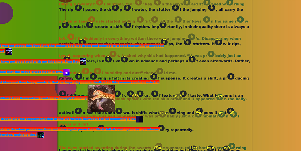 During a sweaty hot summer, the ‘o’ key on the keyboard, because of an overabundance of humidity and dust, stopped working and simultaneously started adding ‘o’s to all the other keys on the same row left of it. Suddenly in everything written there were jumping ‘o’s; disappearing when typed, appearing when not. In their moving with contingencies and multiplicities, each o tastes, drops, stutters, colours, surges, emerges like never before and never again.