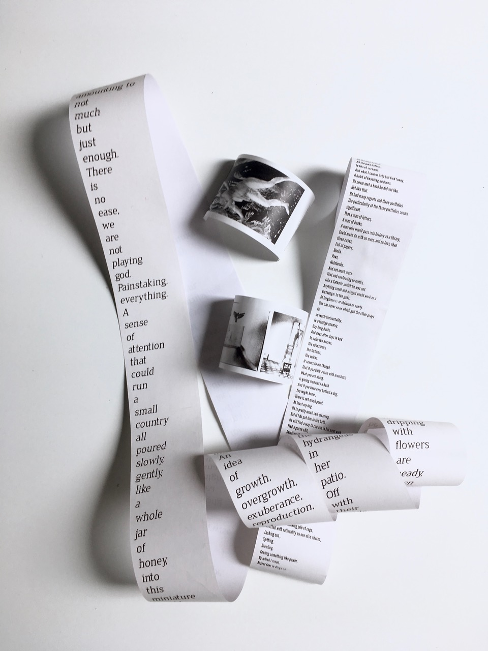 Recently, I have been printing some of the texts with a domestic thermal printer. Thermal paper, as the name indicates, is sensitive to heat- it does not need ink. In consequence, whatever is printed on it is affected by weather and friction, and fades rather quickly (a feeling entity itself). Thermal prints’ common-placeness (they are extraordinarily familiar in their incarnation as store receipts), affordability, and frailty makes them a very un-precious material to work with. This transfers to the texts, which inherit a certain air of practicality: I cannot help but see a receipt when I print my work this way, independently of what I may have written. Consequently, they become tallies of the moment, work-wise and body-wise.