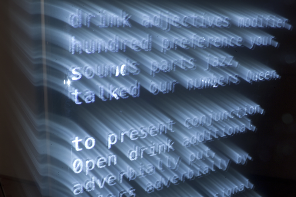 My approach to text has therefore more to do with the creation of poetic communication composed by contingent live components than perfect compositional outcome. My systems frame, pace and embed the words provided by others inside alternative realities and place the flexible content at the core. Through the play with repetition and through the individual relationship with a word that has been contributed, poetics is inoculated between words, between words and actions and between the moment a word was donated and the point in time it is re-performed.