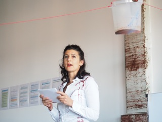 For example my latest performance lecture “Excuse me, your picture is aslant“ (2018). Here I introduce myself as an expert on Erving Goffman’s Frame Analysis (1974) and announce that I will be lecturing on the organization of experience. Following, I mix different colors that are filled into a paint container hanging from the ceiling and piloted by the performers as well as the audience with four attached strings. Collectively the participants organize themselves within the ‘artwork’ that is in the process of being made. This allows us to consolidate and negotiate Goffman’s concept of breaking frame, introducing different modalities of being able to relate to theoretical thought.