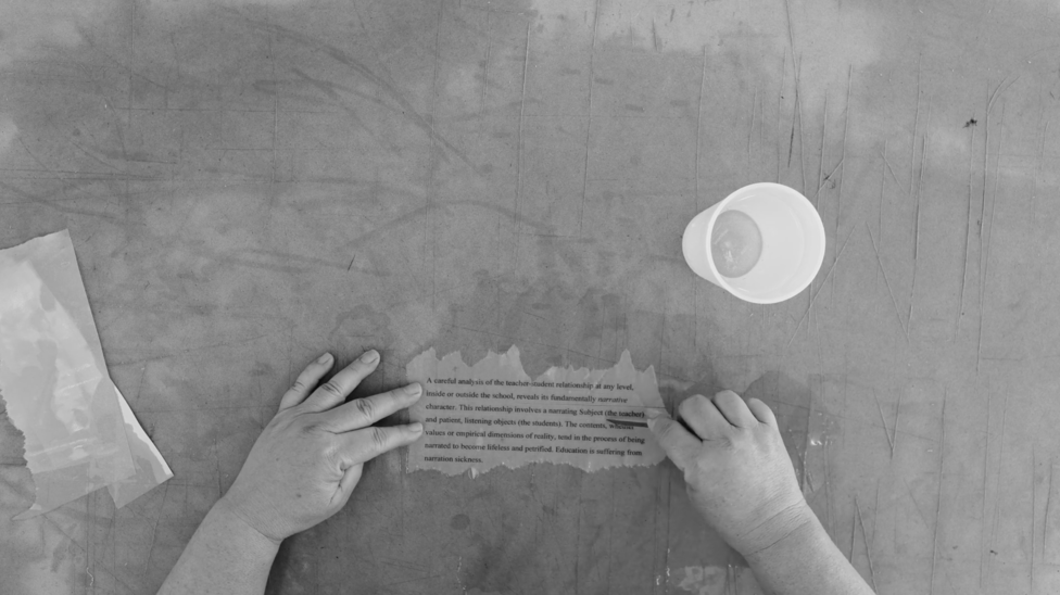 This excerpt is from a performance video (21:15) shown as a keynote for Fielding Architecture: Feminist Practice for a Decolonised Pedagogy, Brighton, UK, June 2019. It takes to heart Paulo Freire’s text Pedagogy of the Oppressed in a practice that cuts across text as a demonstration of how the English language is heavily regulated by longstanding patriarchal and colonialist structures of verbal and written expression and how susceptible they are to being, sabotaged, disrupted and resisted if only by subjecting them to a bit of water play. Here, language is worked according to its material constitution to write its own life, with my life, in the same way a lump of chalk, charcoal or soap redistributes its bodily fluids across a drawing or writing surface. Language teeters towards the concrete with a vitality in its own making and unmaking, adapting J. L. Austin’s famous book title, Doing Things with Words to ask “What can words do?”