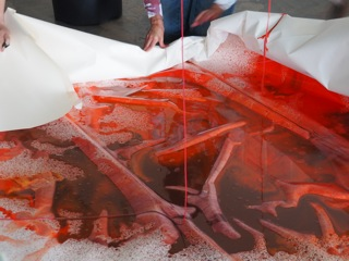 For example my latest performance lecture “Excuse me, your picture is aslant“ (2018). Here I introduce myself as an expert on Erving Goffman’s Frame Analysis (1974) and announce that I will be lecturing on the organization of experience. Following, I mix different colors that are filled into a paint container hanging from the ceiling and piloted by the performers as well as the audience with four attached strings. Collectively the participants organize themselves within the ‘artwork’ that is in the process of being made. This allows us to consolidate and negotiate Goffman’s concept of breaking frame, introducing different modalities of being able to relate to theoretical thought.