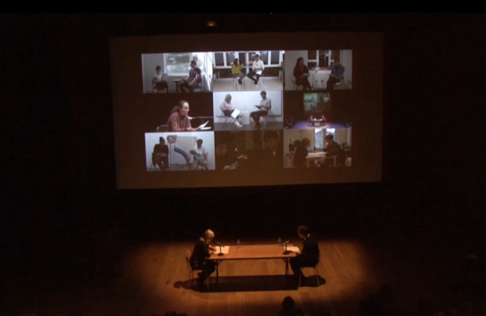 1. Still from A Ritual Resuscitation of Eternal Lovers.  Live performance with lecture, 30 min. Held at InDialogue conference at Nottingham Contemporary, November 2016. Performed by two members of the audience, with a silent projection of previous instances playing behind them.