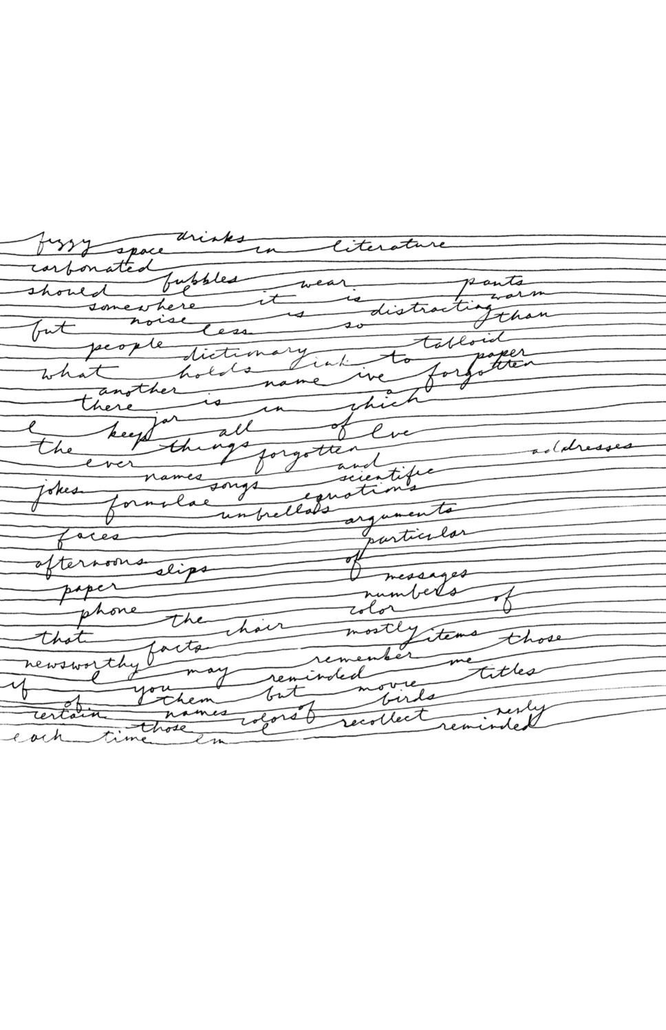 Having been now been making these drawings for over fifteen years, I continue to be interested in the ways in which people respond to texts differently when they are accessed primarily as a visual objects and not as literary objects, but also in how these drawings allow one to see in a new way the importance of the spatial relationships between words and the spatial aspects of signification.  Friends who have seen the drawings have commented on the fact that they resemble, among other things, nets with words tangled in them, telephone wires, ploughed fields, sheet music, and EKGs.  I did not intend to create drawings resembling or evoking any of these things when I was making them.