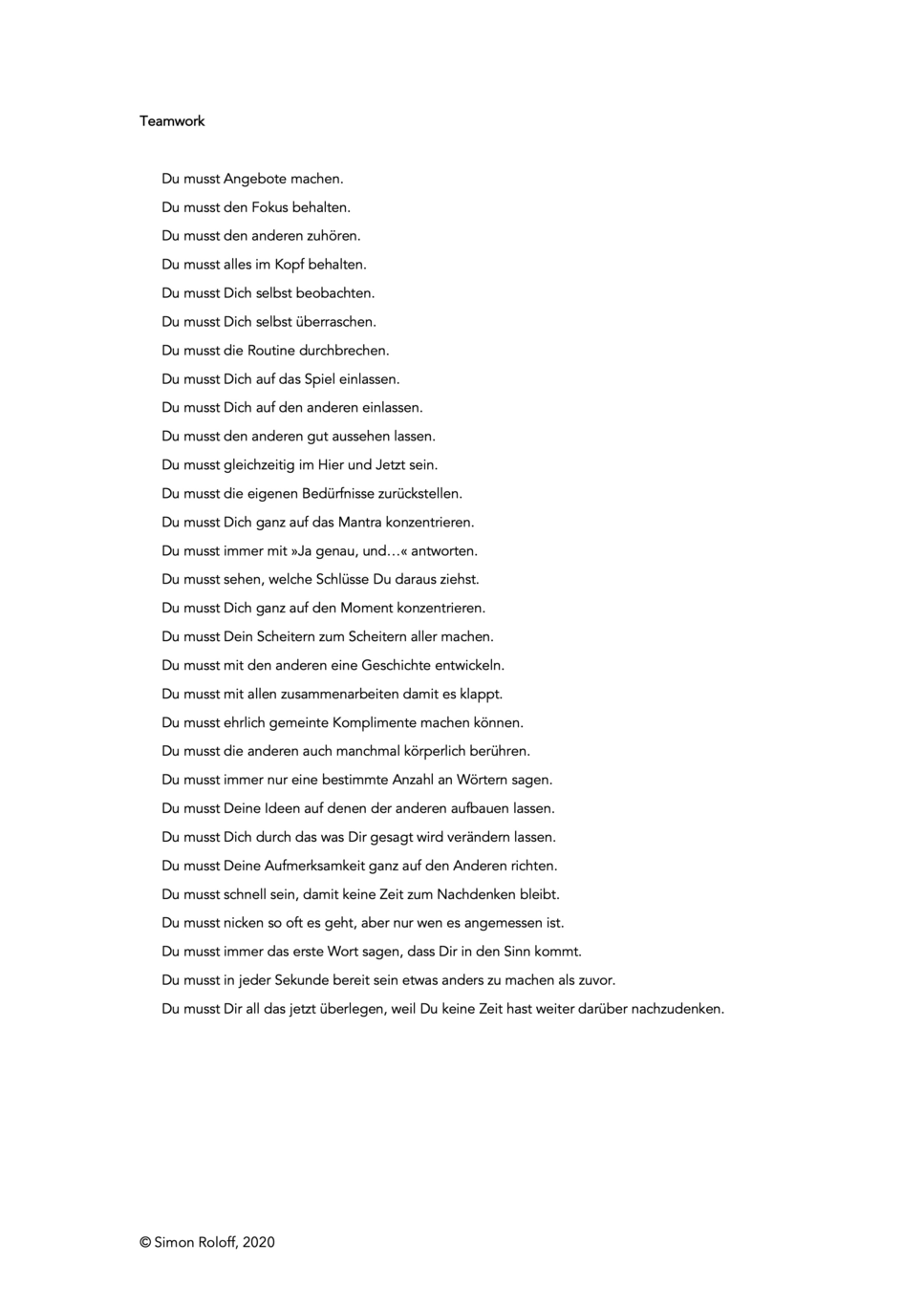 For a book about creativity as a normative requirement in today’s middle class I researched the coaching practices and exercises of improvisation in management training. Being able to flexibly react on the spot in rapidly changing circumstances has gained in importance in today’s work environment, i.e. where team-work requires extensive adaptability, even more so in times of digital work places. Techniques of so-called »agile management« become increasingly relevant, as there is a constant need for re-assessing of objectives and re-purposing of resources to ensure greater velocity and adaptability of production. To make the necessary skill set and attitude achievable, a number of improv-classes are targeting middle- to low-level management-trainees. By submitting to exercises developed for actors and actresses in theater sports they are supposed to learn »to go with the flow of things« and »to catch the moment«. Meanwhile, and somewhat counterintuitively the work books used to teach this spontaneous behavior to today’s work force are employing the verb »müssen« (germ. to have to) to somewhat great extent. With a nod to Hannes Bajohr’s »Was man muss« in Halbzeug (Suhrkamp 2019), I scanned these publications, and, using an algorithm, filtered all the sentences that contained »müssen«, changed them to the imperative with a unified addressee and then arranged them in order of their length. The result seems like a desperate attempt to teach social behavior to a machine and/or the rule book of a game whose objectives must not be revealed to the players. Also, its repetitiveness seems to mirror the tiresome work of being the flexible subject of today.