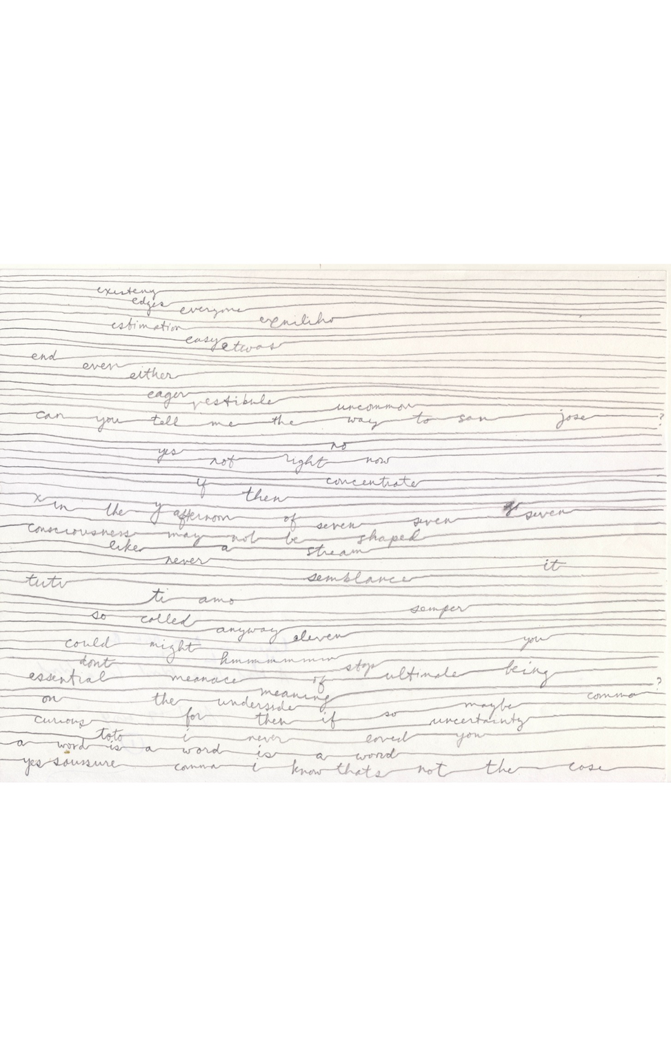 Having been now been making these drawings for over fifteen years, I continue to be interested in the ways in which people respond to texts differently when they are accessed primarily as a visual objects and not as literary objects, but also in how these drawings allow one to see in a new way the importance of the spatial relationships between words and the spatial aspects of signification.  Friends who have seen the drawings have commented on the fact that they resemble, among other things, nets with words tangled in them, telephone wires, ploughed fields, sheet music, and EKGs.  I did not intend to create drawings resembling or evoking any of these things when I was making them.