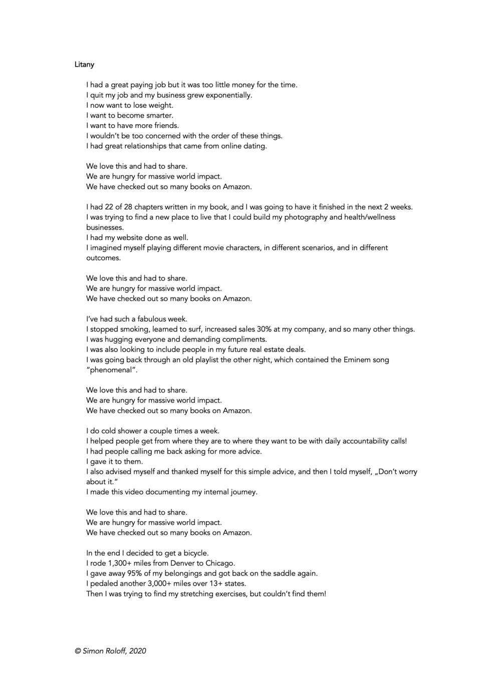 A few years ago, I attended the seminar Unleash the Power Within by Tony Robbins in Chicago. This seminar promises instant self-realization through simple behavioral changes by employing a rather bewildering mixture of confrontational therapeutic intervention, mass-meditation, after-work clubbing, Sunday church and fake archaic ritual. It regularly draws 20.000 to 30.000 participants, usually taking place in sports venues or concert halls over the course of three to four days. People are paying literally thousands of dollars to attend. While similarly interested in the techniques employed for behavioral changes and the motivation of the participants, I used a webcrawler to read out the posts and comments in a closed Facebook group for the event (at that time Facebook had not changed its API yet, so that was still possible). I filtered the result for among other things, all sentences with »I« and »We«. Scanning through them it suddenly hit me, how much this event was driven by fear and a need for belonging. Most people posting in the group had suffered some major economic setback, the fallout of the crisis of 2008 still being felt, and while they obviously hoped they could be O.K. if they changed a few habits and learned to believe in themselves more, they were also looking for community and advice. I arranged the sentences by hand, trying to tell little stories of self-realization while at the same time repeating some of them over and over, so there would be an element of prayer or of a litany to the resulting poem.