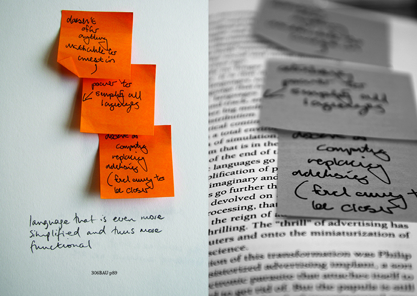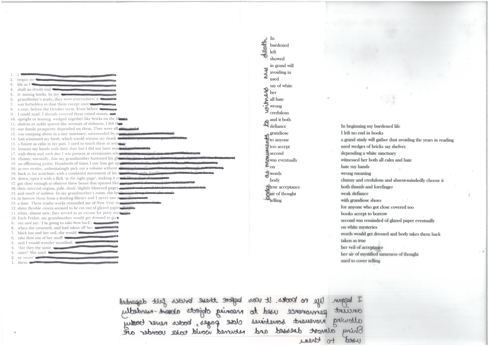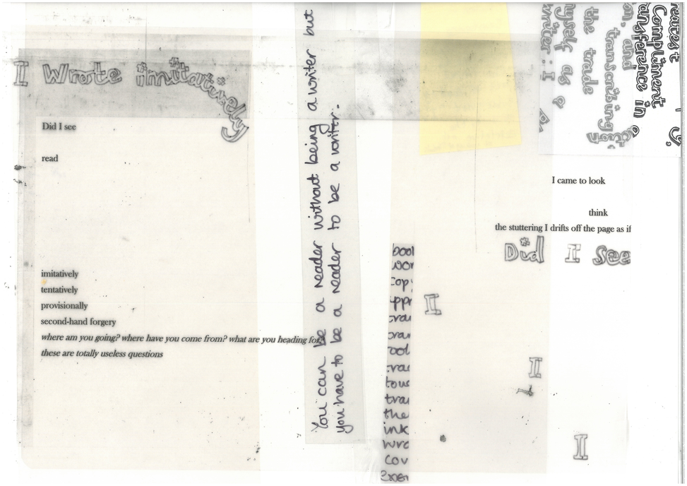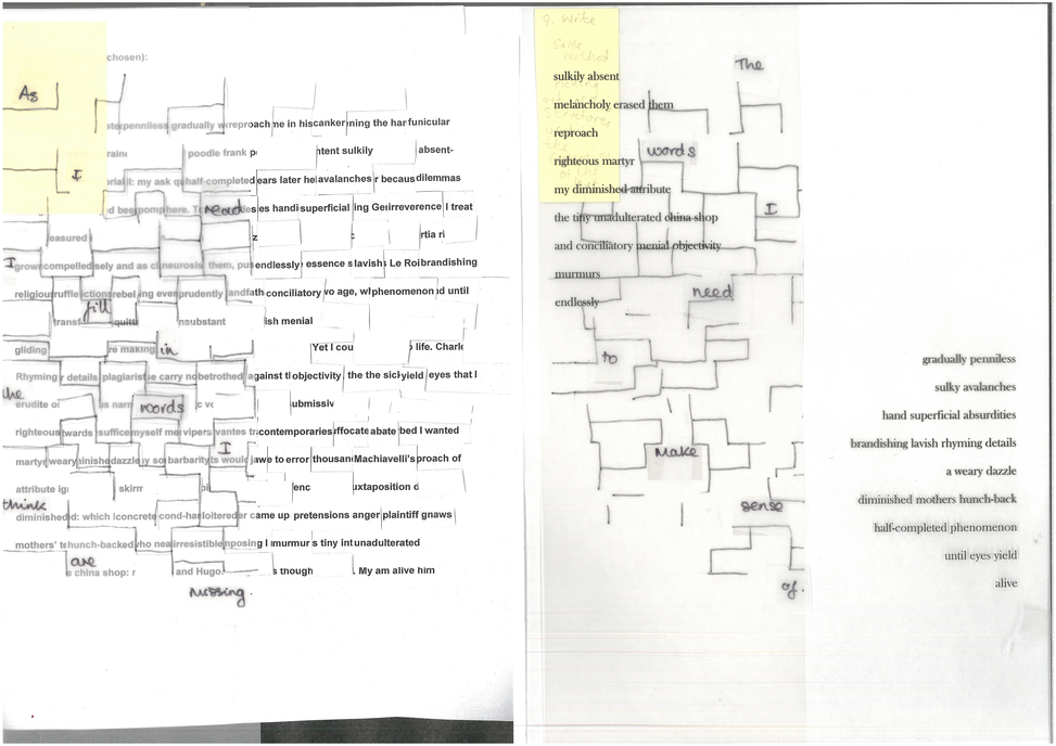 This experimental work assembles fragments from a material dialogue around reading, writing, and making. This collective response to reading is both ‘insolent and smitten’. Jean Paul Sartre’s autobiography Words [Les Mots] provided the source reading material though what is generated extends beyond any faithful study of the original text. Interruption, error, and distraction are considered useful tools, while collaborative working enables a negotiation of sense as the construction of meaning is re-fused and folded between the coherent and the asemic. By developing a ‘collective utterance’ (as a minor gesture) the intention was to dislodge the author’s position, and experiment with a cutting together-apart action of the author, reader, and maker to produce a multiplicity. Questions were posed about how disruptive the processes would become (how far would the work stray, fragment, or unhinge the original?), or if it would remain devoted (tied visibly or thematically to the text, respectful of the original source). I associate my methods with a description by Anotonia Point in ‘Philosophising Practice’ about ‘active laziness’ in order to challenge the binary of discipline and laziness.1 She uses relaxation to challenge this dualism, as one of her criteria for ‘doing-inflected-as-practice’ because it ‘disturbs the logics at play […] by unsettling […] habits of thought’.2 I aim to challenge the terms ‘good’ or ‘real’ reader, which implicitly engage in the dualism of productivity versus stagnation.3 By materialising flighty associations, errors of memory, and glancing as reading I can mobilise these tools for interruption and activation.