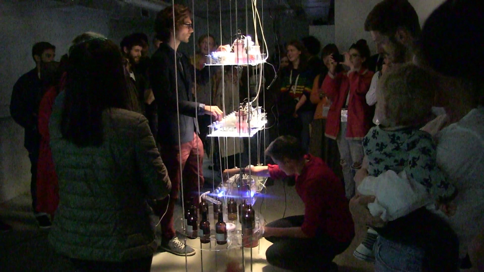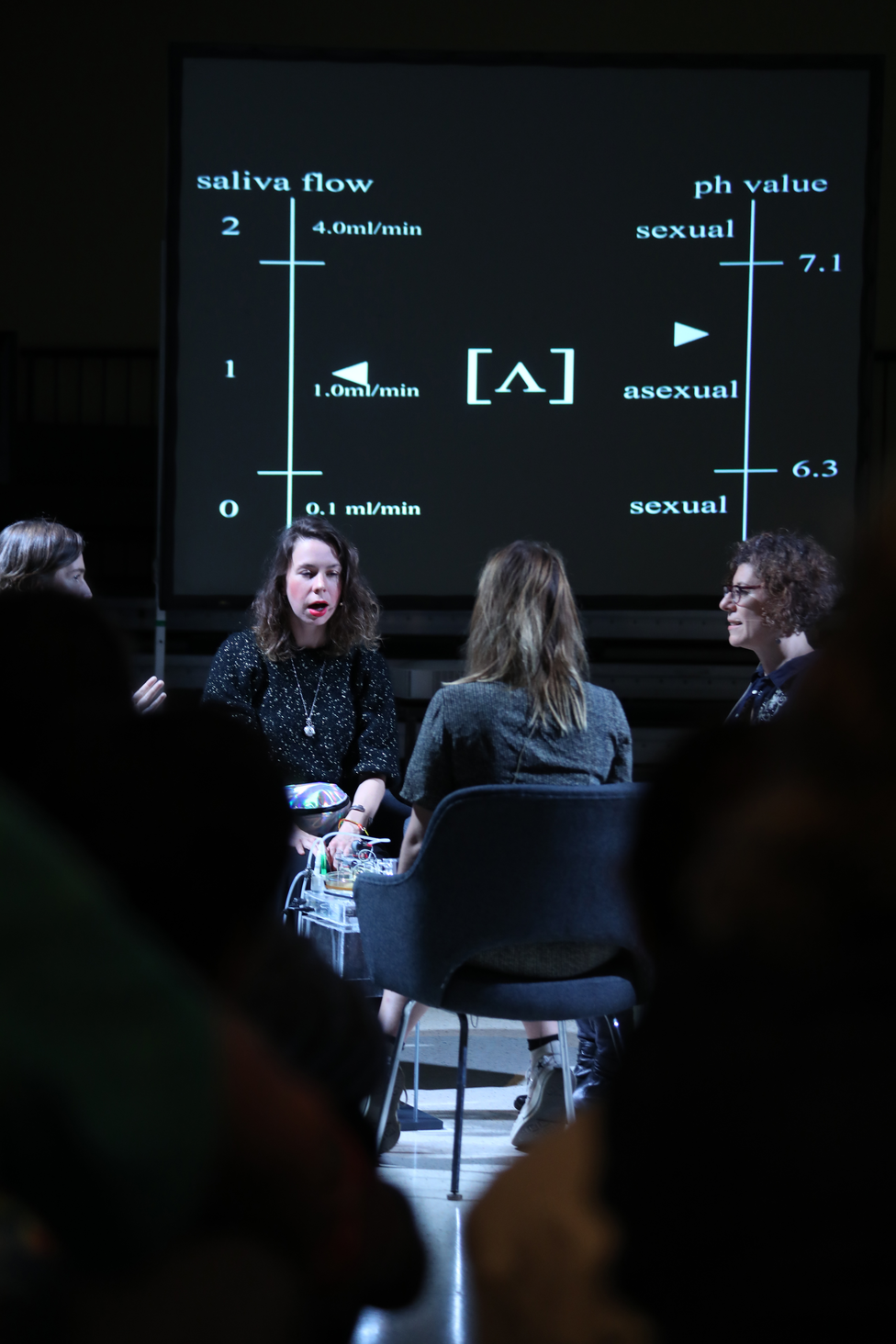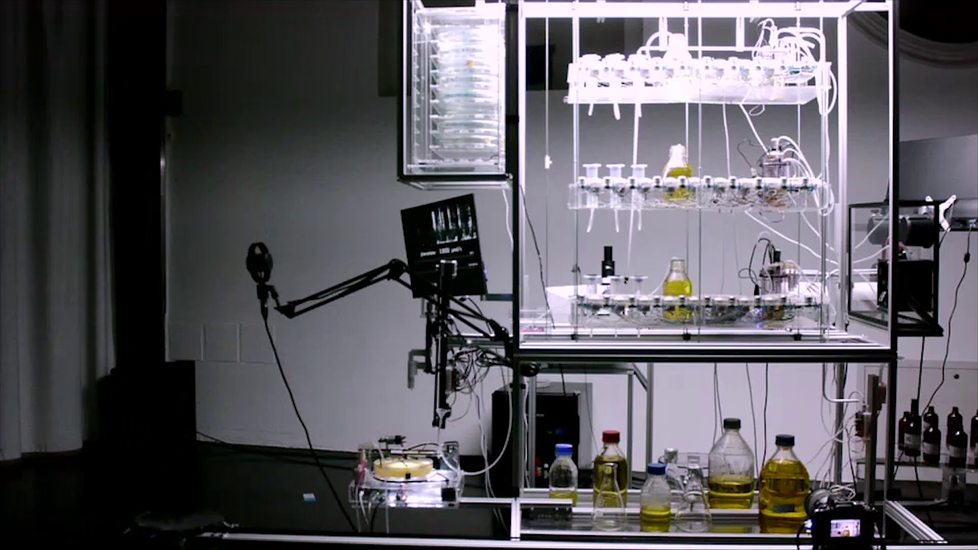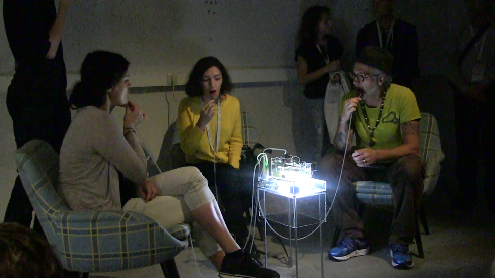 The performance associated with this practice, Microbial Keywording, aimed at a hybrid language that not only processes formal symbols but interacts with the microbes in the speaker’s mouth. MK argued that the metaphors that have historically been used to frame the relationship between oral microbiota and speech cannot account for the co-creative material relationship between human speech and microbial, environmental and biotechnological needs. In MK, oxygen, moistness and temperature in the mouth present themselves as the condition related to the rhythmic alteration of salivation and breath during actual speech. During the performance, the speakers’ oral cavity becomes a unique wetland, moisture as a precondition both for the microbes, for their life and for the phonemes to be spoken. In MK we harvest oral yeast microbes from the audience. Via a spectrogram, repetitively spoken phonemes drove pattern pumps, which added pheromones which were then faded out, to the microbes. In the microbes, for some replication cycles an ecological adaptation to the individual phonemes persisted, affirming – in our definition – some phonemes and deleting others, thereby improving the eco-sphere in the mouth by changing the alphabetical order of the input phonemes. The audience observed the adaptation by respelling words. MK proposed ‘microbial speech’ as a category between semantic and phonetic meaning, with a transcorporeal mattering between speech, aiming at a language becoming a biological state in order to protect its own ecology. Much of MK’s vivacity was based on Lucie Strecker’s immersive humanist performance, emphasizing the importance of space and sensual environments and focusing on the individual audience experience.