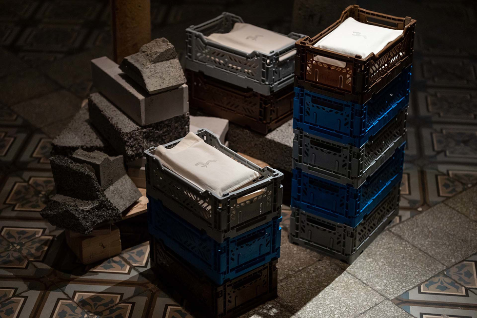 There is an installation of two road signs inside a gallery. Part of the floor is washed out and appears whiter than the rest of the floor. In the front, a concrete stand holds a steel pole holding a street sign of a blue circle containing a white graphic of two public monuments with a red line striking through the whole sign. Next to the pole are concrete bricks on a wooden crate. The wooden crate is holding an upright wooden plank holding a road sign of a yellow triangle with a red outline, with a black graphic of a bird in flight. There are plastic crates in colours blue, brown and grey. The crates are holding white cloth envelopes. There are seven books installed on the wall on either side of the signs. There is a radiator behind the signs on the right side. (Image 1) A concrete stand holds a steel pole. There are plastic crates in colours blue, brown and grey. The crates are holding cloth envelopes with a black stamp of graphic of a bird in flight. There are concrete bricks on a wooden crate. All objects are placed on a tiles floor. (Image 2) Under the text a small book is held inside a plaster stand that is installed on the wall. The book cover shows a plinth without any statue. The colour of the sky in the background is orange (Image 3)