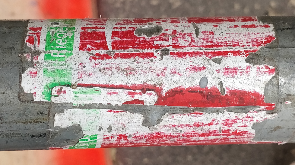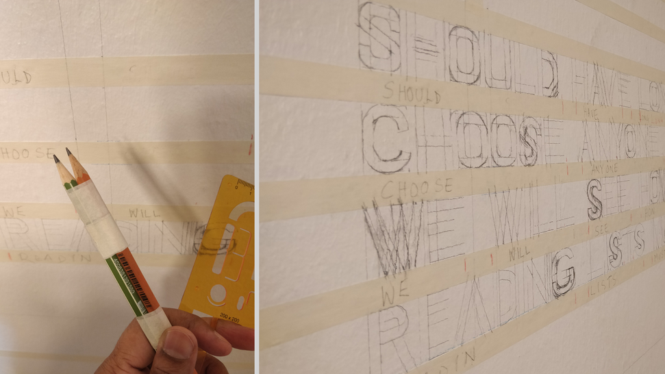 Each time an iteration of the mural is made it becomes instinctual to bring elements from in and around the space into it. The outside becomes the palette. IMAGE 1 evokes a sense of application (of new information) and removal (of old information). (IMAGE 2 – 3) Two pencils are taped for letterform construction. In 2006, I learnt this technique from typographer Mahendra Patel. This technique is useful for serif, sans-serif, script, as well as decorative styles of type. Letterform construction, styled after the sans-serif font Helvetica for accessible reading and ease of drawing the letterform. The masking tapes serve the purposes of guidelines.