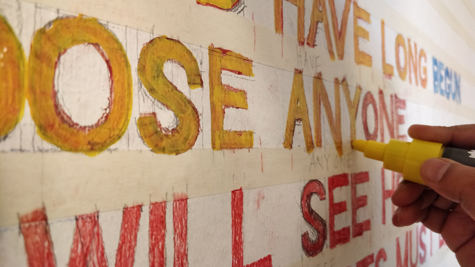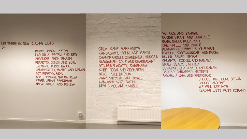 The first invited artist-poet is Vidha Saumya with a mural titled Reading-List. The aim is that the artwork, now installed in an intimate space where students gather to work, is entwined into the activities at the faculty spurring reflections on writerly agency and how writing and reading is being unceasingly defined by master narratives. The poem Reading-List proposes a list of 96 authors from India who should be in global reading lists – the list is potentially endless. The mural addresses literature by authors names in multilayered capital letters and brings to the palpable foreground the concept of cannon to be discussed beyond normative intents.