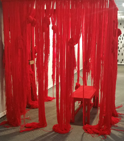 Joy's Ogede is then its own talisman and is activated by the viewer, but the spoken words of the viewer. It offers a certain degree of privacy so it is not known what people say when they enter the yarn draped chamber, very much like the confessional booth in a Catholic church- One enters such a booth to speak, it is in the confessional chamber that absolution can be obtained. Joy's Ogede is not so much an opportunity for forgiveness as it is an opportunity to ignite the voice, to expand through utterance desire, shame, considerations and solutions. Language is employed in my works as an active device, not for its aesthetic considerations alone, but for its ability to activate a space and connect beyond walls of limitations of mere thought or policies of constraint.