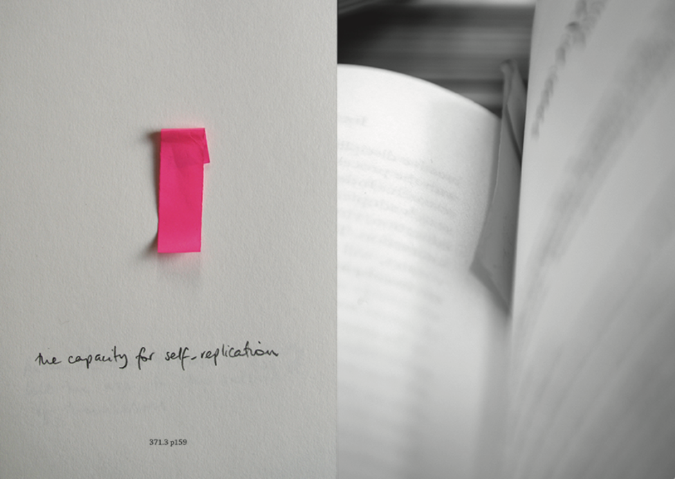This book work materialises the act of glancing as reading using a deliberate meandering through the Library space. Virginia Woolf recognises libraries as sanctuaries affording us license to read what and how we wish, a place where no authority should possess the power to instruct on how to read.1 Faced with the organisational structure of the library, or a instructional contract to behave in a particular manner, users often take delight in finding their own path. In this project I use distractions while reading to develop a speculative and spontaneous line of enquiry across the Library shelves. Ignoring traditional search methods, I follow the visual detritus left by those before me. Drifting through the space following found bookmarks, post-it notes, and the marginalia of others I construct pieces of visibility using a preplanned but chance strategy. Distractions that interfere with immersion or flow become a tool for scrutinising reading behaviour and challenging the premise of a good reader. These bookmarks are a reminder of the physical presence of previous readers that have already encountered each text. Their annotations pose questions about my own engagement as I note phrases that stand out in the moment of glancing. In Drawing out Language:Library Collection research is visualised rather than articulated, opening a space for fluid associations between the bookmark, note, and image. Hélène Cixous suggests poetry over the novelistic form, allowing for fluidity of associations between signifiers, as opposed to the established structure of a narrative.2 Here, photography functions as poetry.