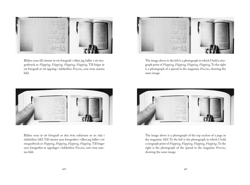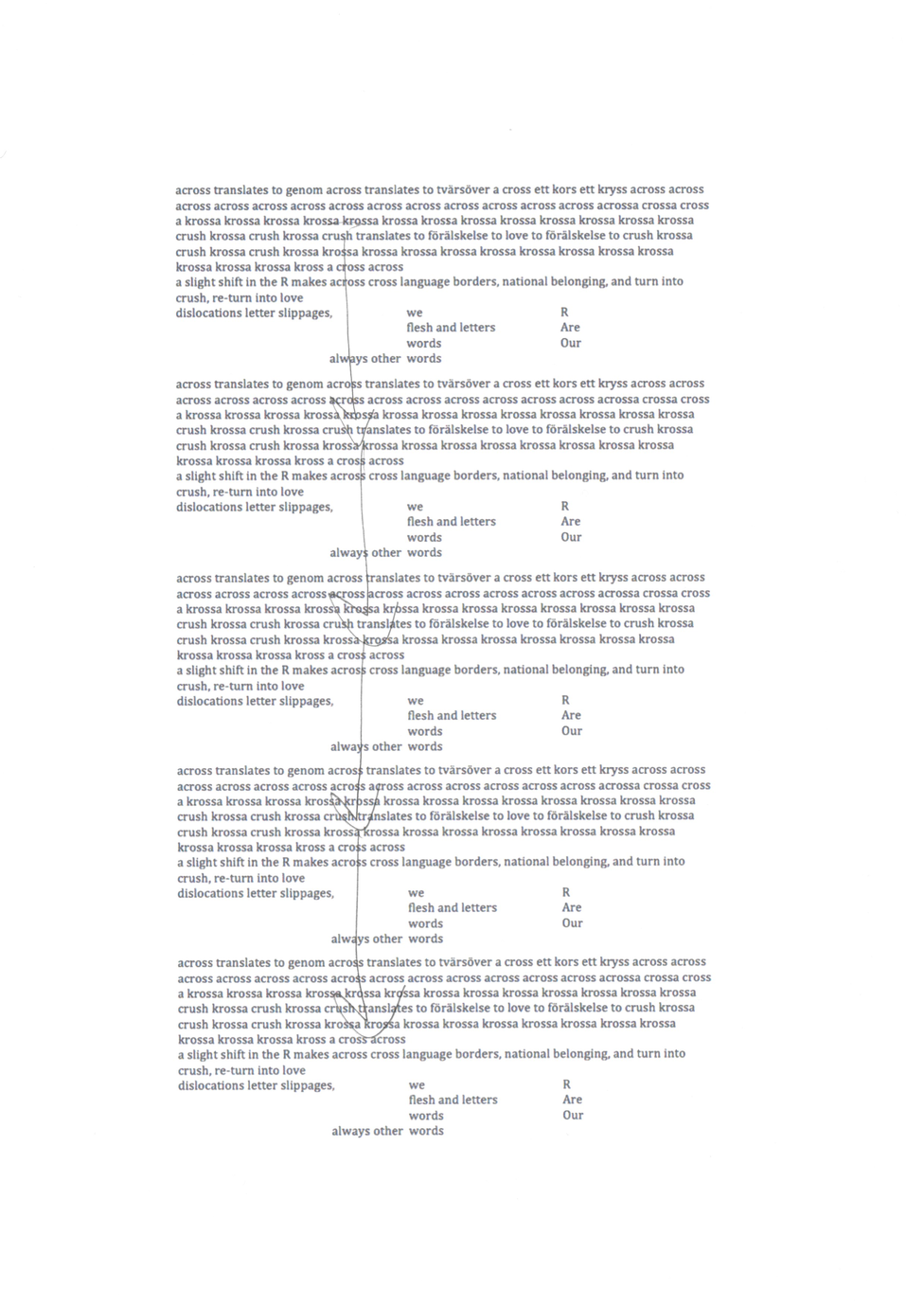 Here I draw on the translator Suzanne Jill Levine who in her book The Subversive Scribe writes about the cyclical ongoing of empires, colonizations, and migrations, and how these confirm the problematic nature of language boundaries. She holds that indeed all languages contain other languages and there are secret bonds between them. As I write across Swedish and English I try to listen to these linkages, the hidden or latent historical bonds, as well as sudden unexpected sparks. I work with cross language punning, polyphonic meanings and phonetic synchronicities and shifts. Rather than attempting to find the one settled version, I look for generative paths, ever new versions and divergences. The translational writing that I engage with then, isn’t so much about trying to recreate a text in another language, but rather to continue writing within the already intricately entangled movements of these languages.