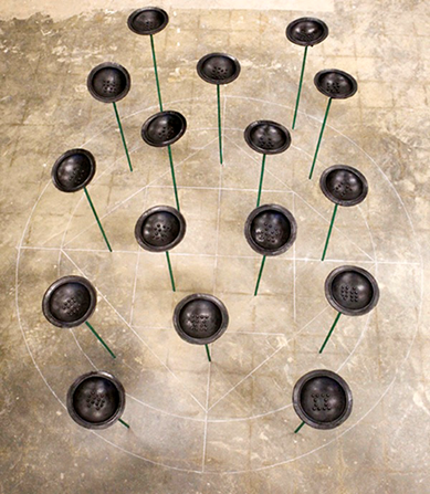 My work in the embodiment of utterance. Mojo is an installation of cast iron lids, embedded with the enigmatic code of the Ifa corpus, known as Odu. The sculpture is an implied amplified device that expands the human language of prayer. Ifa is the traditional Yoruba spiritual system in place long before Great Britain colonized Nigeria, hence altering the language of the country. The language of Ifa is born of 256 patterns that reveal thousands of verses that speak to the relationship between humanity and nature. Mojo, as in the popular blues song “I got my Mojo working…” is a device in Black culture that is needed to effectuate change in an unjust society. A mojo is capable of being composed of any number of materials, in my sculpture Mojo I combined the forces of Ifa- the traditional esoteric practices of the pre-colonial Yoruba people with that of cast iron the material of industrialization. The Odu signs that surface the inner lids and their positioning within the chalk drawn diagram serve to contract and expand vocalization- utterance. It is only through the spoken word is power to be found. Thought alone will not impact the world, but spoken thought / language / utterance is vibrational and has the ability to alter circumstances. In my practice both professional and personal I employ the power of speaking- using objects that speak, or my own vocal cords, that will connect with the universe. The symbols, as arranged in Mojo, serves as an instantaneous announcement to the viewer as an altar would, It speaks to reverence, articulation and cosmic forces that share a universal language with the viewer's soul.