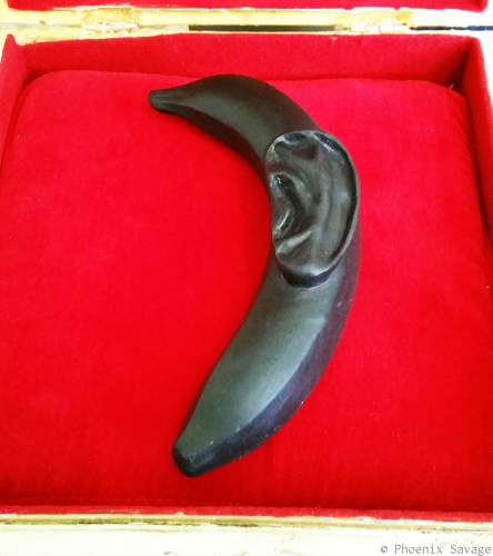 If the viewer chooses to sit down, they are positioned in conversation with a black porcelain banana with an ear presented in a red velvet cushioned gilded box. The ear implies the banana holds the power to hear the spoken or implied thoughts of the viewer. Ears were some of the original sculptures of the Yoruba, and would imply they held the expectation that something was listening. While Western culture predicated the power of thought (Rodin's The Thinker), many African cultures predicated the power of the spoken word. In Yoruba culture as with Black diaspora culture the world is made through language. In many African cultures and this is true of Yoruba culture speech, spoken language functions as a talisman.