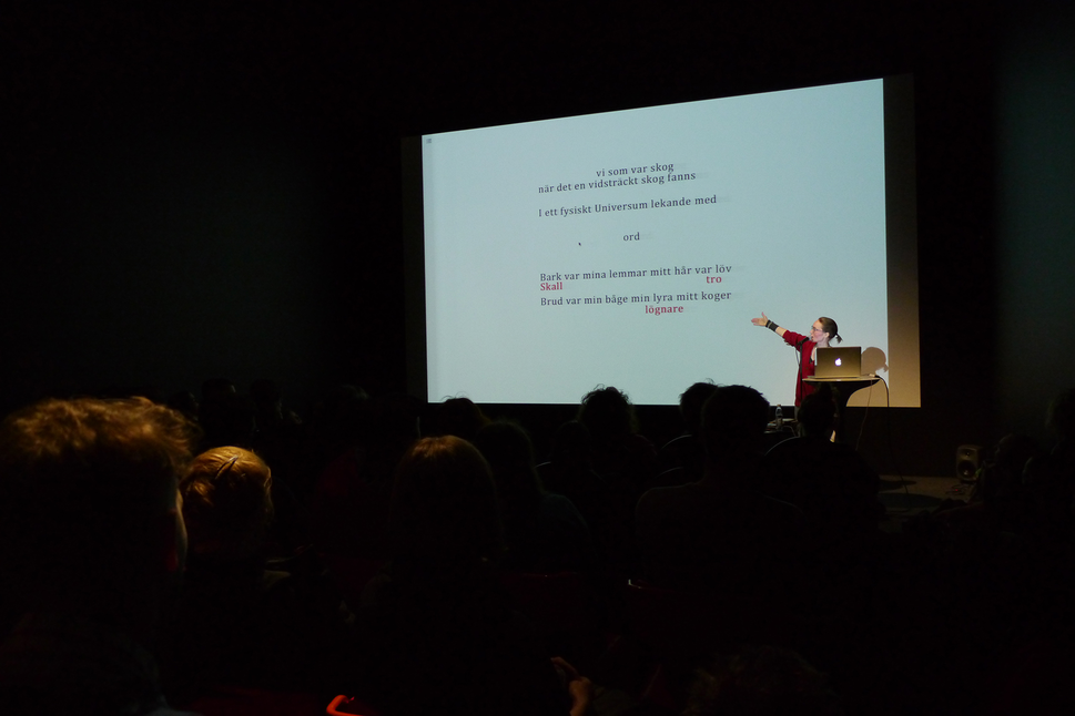 Performance writing is an artistic research methodology that has been—and is—practiced as well as re-formulated by performers, writers and researchers such as John Hall, Caroline Bergvall and J.R. Carpenter. The practice is undergoing constant defining, and thanks to it’s reliance in movement and performing, it might evade being ever fully formalized, or settled.