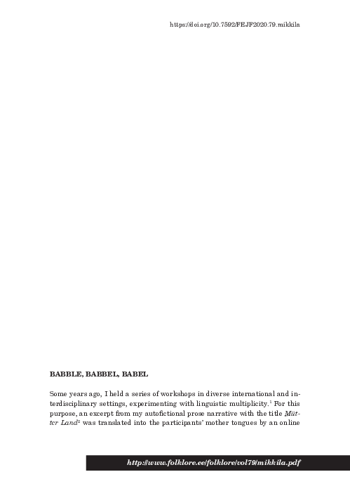 Elina Mikkilä, ‘Babble, Babbel, Babel’ (pp. 91-93) in  “Literary Biographies Without A Fixed Linguistic Abode”. In: Folklore: Electronic Journal of Folklore. 79, 2020, pp. 91-114. https://doi.org/10.7592/FEJF2020.79.mikkila.