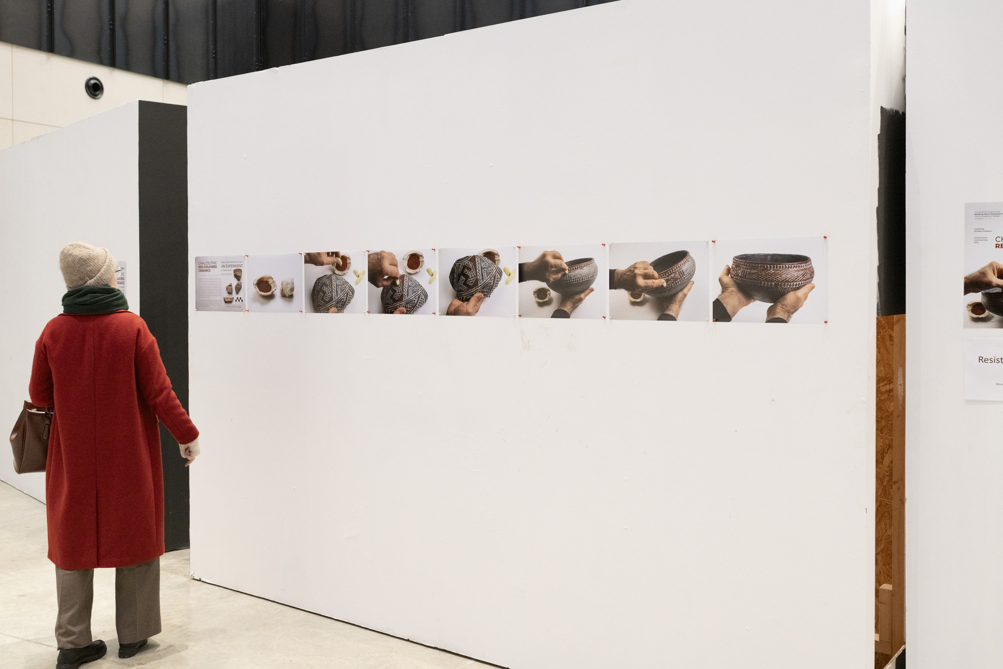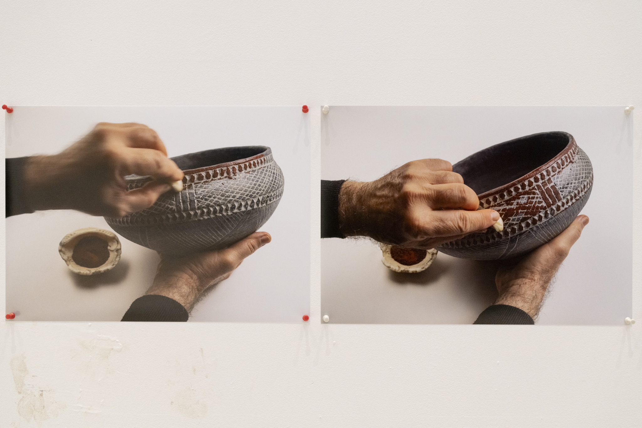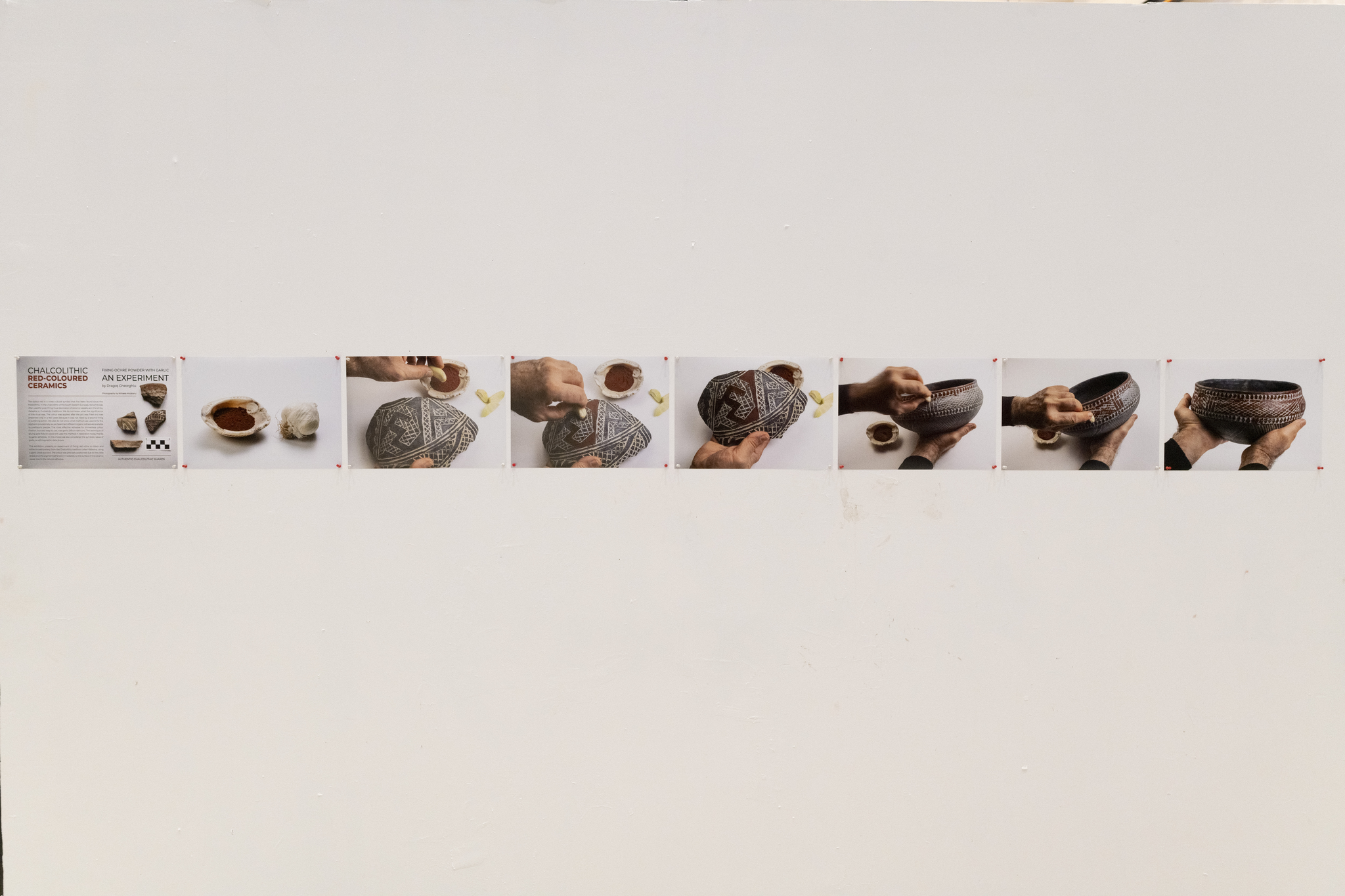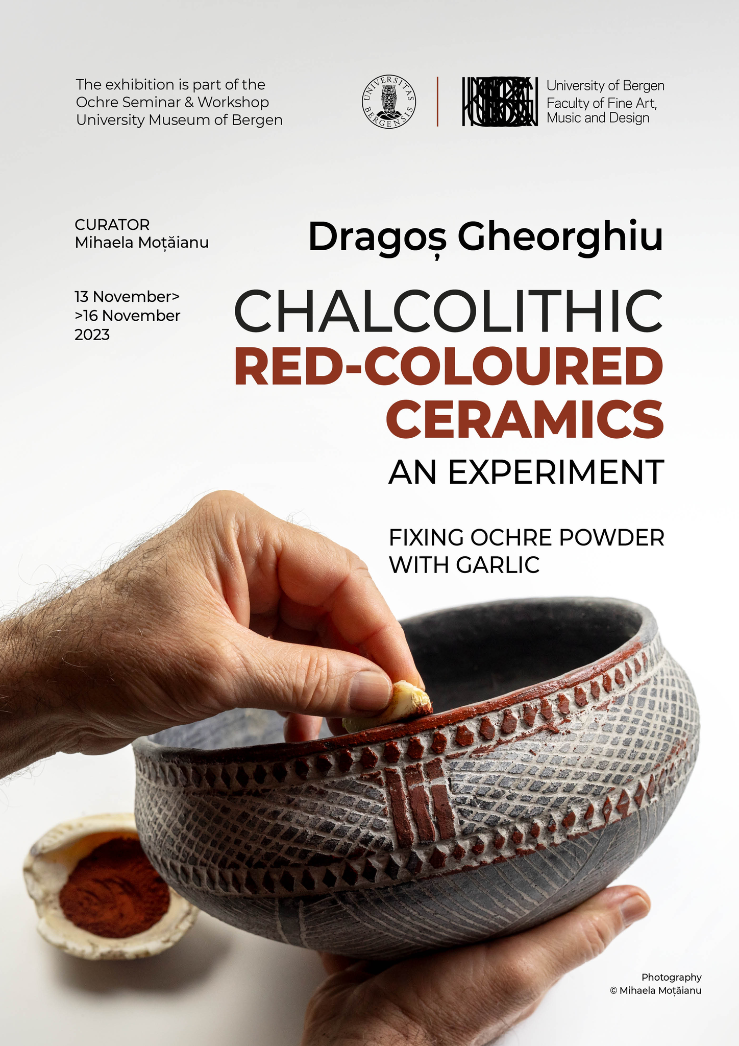 This exhibition presents an experiment of fixing red ochre on black and white incised pottery from the Chalcolithic tradition called Vădastra, using a garlic clove as a tool. The colour was precisely positioned due to the clove shape and the pigment adhered immediately to the surface of the ceramic vessel due to the natural adhesive.