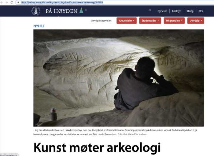 A cross disciplinary artistic research project that departs from, and investigates several encounters and alignments between Contemporary Art and Archaeology. Its primary goal is to create a broad selection of autonomous and collaborative artistic, poetic and scientific expressions and responses to Prehistoric Art and its contemporary images. It will seek to stimulate a deeper understanding of contemporary and prehistoric artistic expression and the contemporary and prehistoric human condition. The participating artists and archaeologists will create autonomous projects, but also interact with each other in workshops, seminars and collaborative artistic projects. The secondary goal of Matter, Gesture and Soul is to establish an international cross disciplinary research network at the University of Bergen and strengthen the expertise in cross disciplinary artistic and scientific work with artistic research as the driving force. The project is financed by DIKU and UiB and supported by Global Challenges (UiB)
