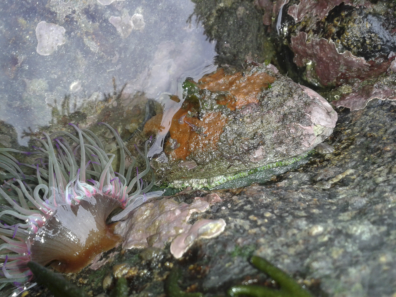 Abalone with a live sponge in its shell and a Green Snakelocks anemone during very low tide in January 14, 2013. Photo Pedro PVZ licensed under the Creative Commons.