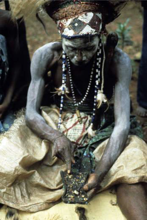 A Luba court historian and high-ranking member of the Mbudye association—which guards and transmits the historical knowledge of the luba kingdom “reads” and interprets the esoteric signs on a lukasa memory board. no two recitations of a lukasa are ever the same as they depend on changing political circumstances and are performances of memory in the present.