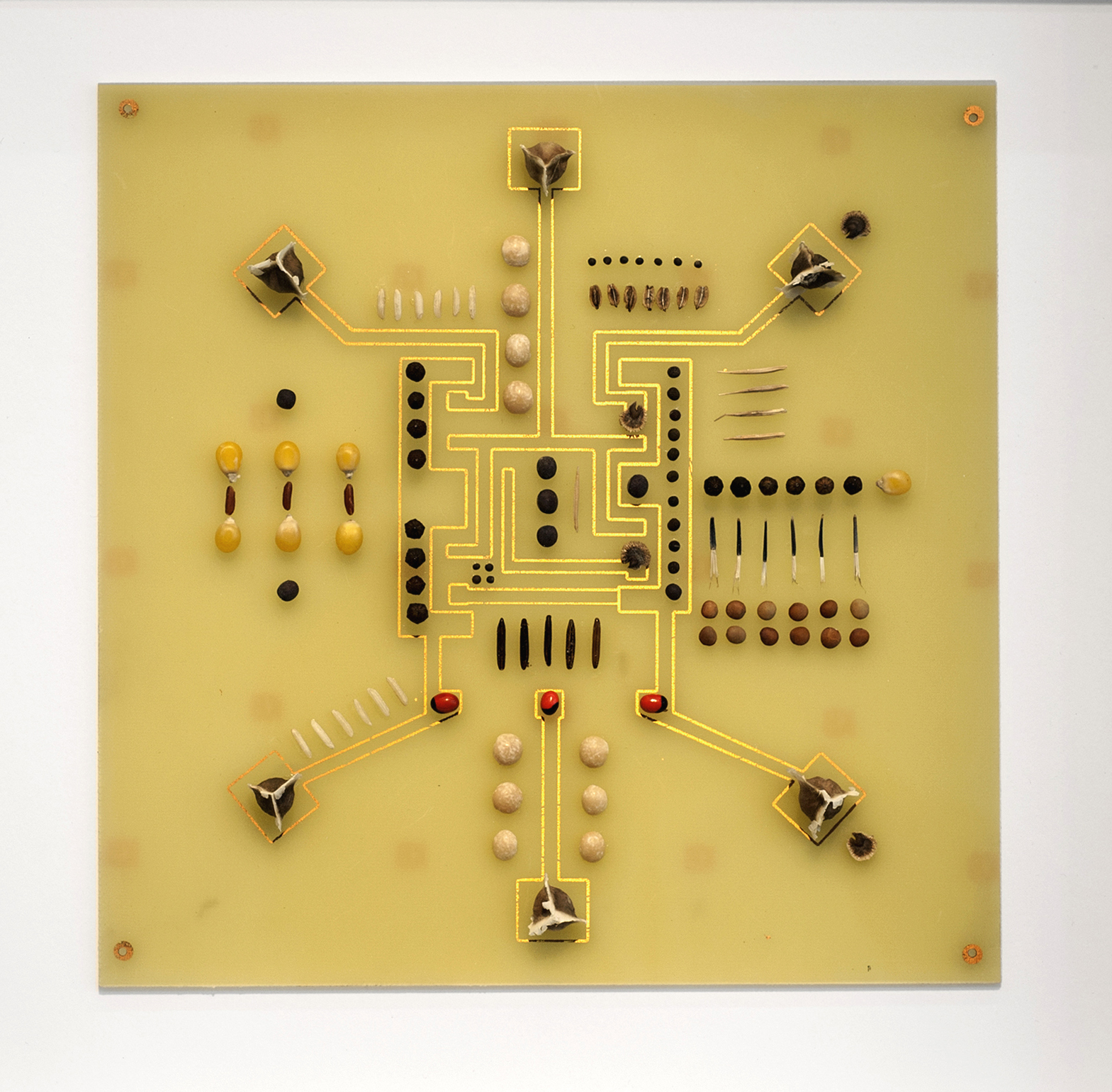 Immortality Drive consists of various graphic translations of the image of the first monolithic silicon integrated circuit chip, invented by Robert Noyce of Fairchild in 1961, transferred on a copper circuit. This world changing invention is immortalised on a PCB (Printed Circuit Board) and decorated with a wide variety of seeds and grains from around the world, as in the configuration of transistors and electrical components. Together they create a Lukasa1, or memory board, that imitates the ones used by the Bambudye within the Luba Kingdom in the Democratic Republic of Congo throughout the 19th and 20th Century, as an archive for the topographical and chronological mapping of political histories, and as a means to recollect important people, places and mythical migration routes. The seeds were collected from the Botanical Garden of Meise (Belgium), Jardin Botanique de Lubumbashi (D.R. Congo), and various other places around the world. They are organised according to the graphical outlines of the first monolithic silicon integrated circuit chip and evoke the memory of seed collection, preservation, modification and militarisation.