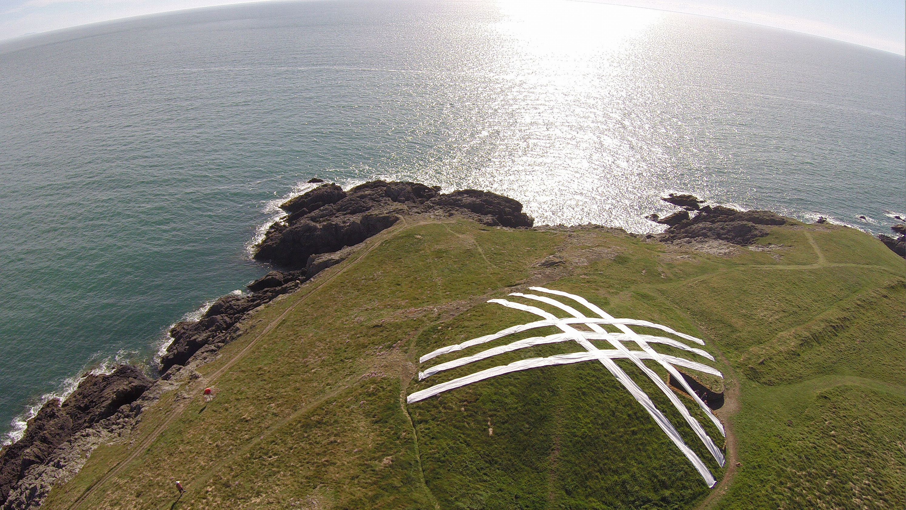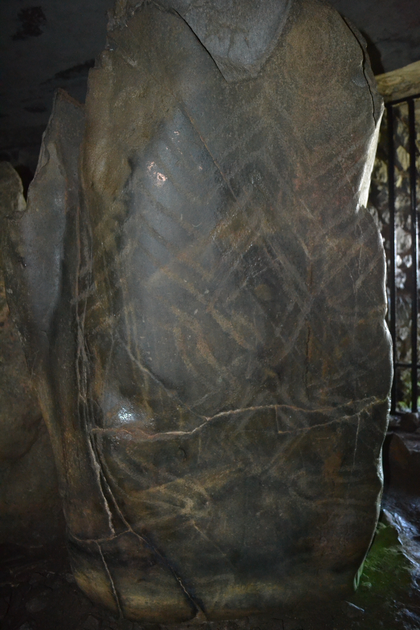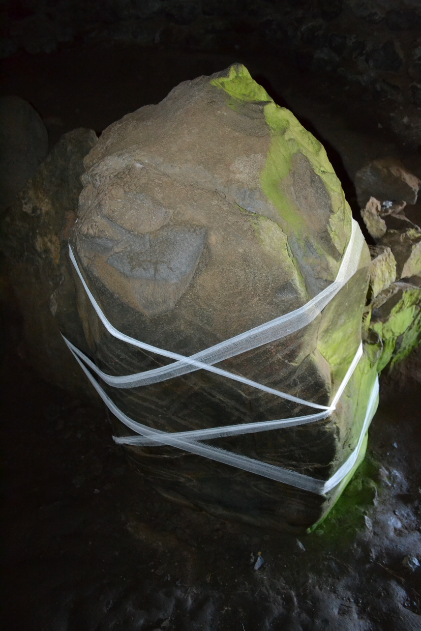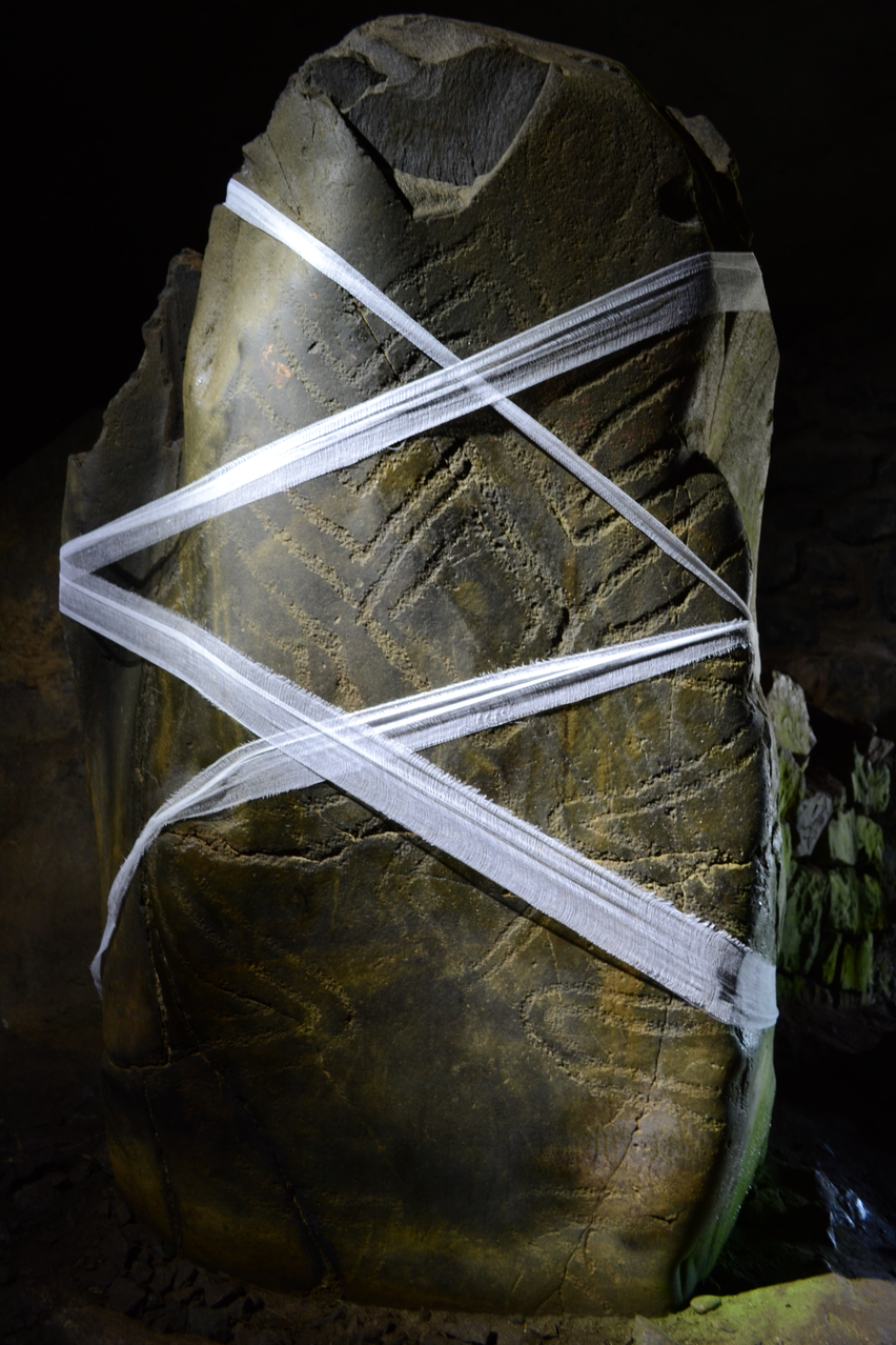 “[An] example of how bodily memory resulting from rhythmic activity shapes imagery is that of the engraved stone inside the Late Neolithic passage of Barclodiad y Gawres in Wales, Anglesey Island (see Nash & Stanford 2011; Nash 2008). The tomb, dated to about 3500 BCE, is the interior of a cairn positioned on a high cliff. In 2014, within the GestART project, coordinated by Professor George Nash, I had the opportunity to create a contemporary art work that would present the monument to the public. While searching for a representative image to achieve this, I identified on the engraved standing stone located to the right of the entrance to the funeral hall, a lozenge pattern similar to the one on the Cucuteni-Tripolye figurines. (…) I repeated these gestures on the stone, using textile bands and strings, in order to embody the ergonomics and the rhythm of the plaiting described by the engraving. (…)” [Figs. 4-6]
