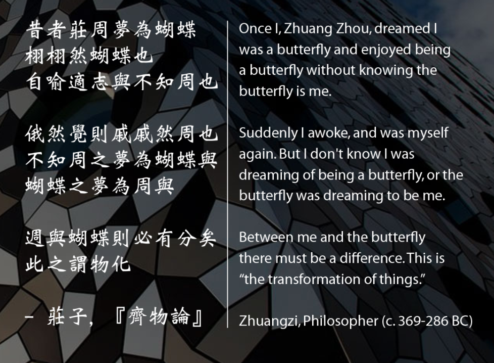 It is from an ancient Chinese philosopher (Zhang Zhou) allegory as follow:
