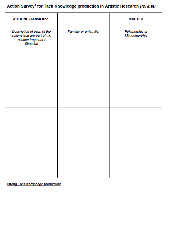 This personal knowledge relates to the singular factor that could be enacted in an artistic research project.Writing on the actions of the ‘MASTER’ that are still unknown or not known yet, might become the ones that ‘invite’ to produce tacit knowledge. These actions should not be seen as ‘genius’ actions in itself. These actions are part of a construction, a set up in a context, namely: the set up of an artistic research.