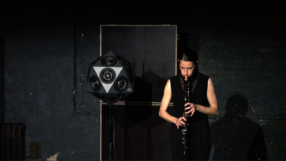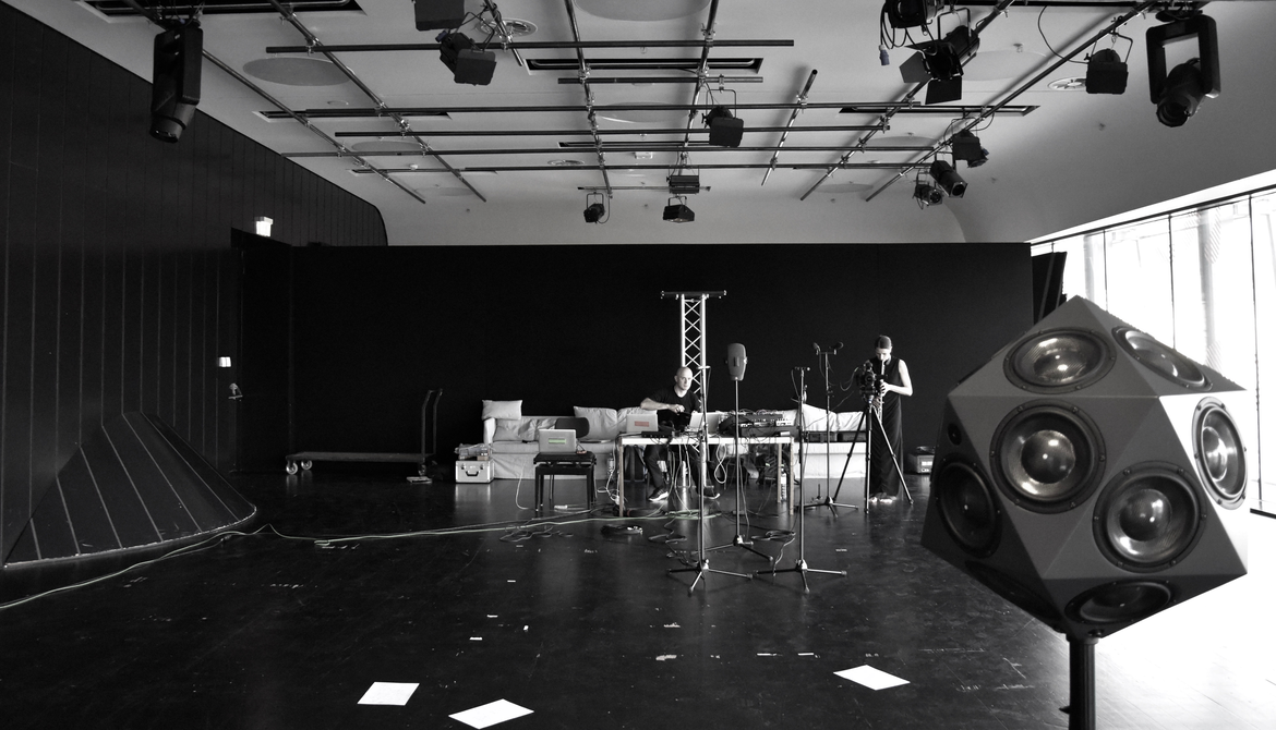 Sharma who has written several papers proving the instrumentality of the IKO and its ways of orchestrating space, was now confronted with a task which could nihilate everything he found out within one performance. But the contrary happened. Already in their first session Susanne Fröhlich got the feeling of playing chamber music, perceiving the IKO not as a usual loudspeaker, but rather as a colleague and partner on stage. This was only possible due to Sharma’s expertise on how to perform with the IKO as well as his ideas and openness to bring the IKO into context with another live-performer, understanding both instruments as sound projectors that make sound spatially tangible.