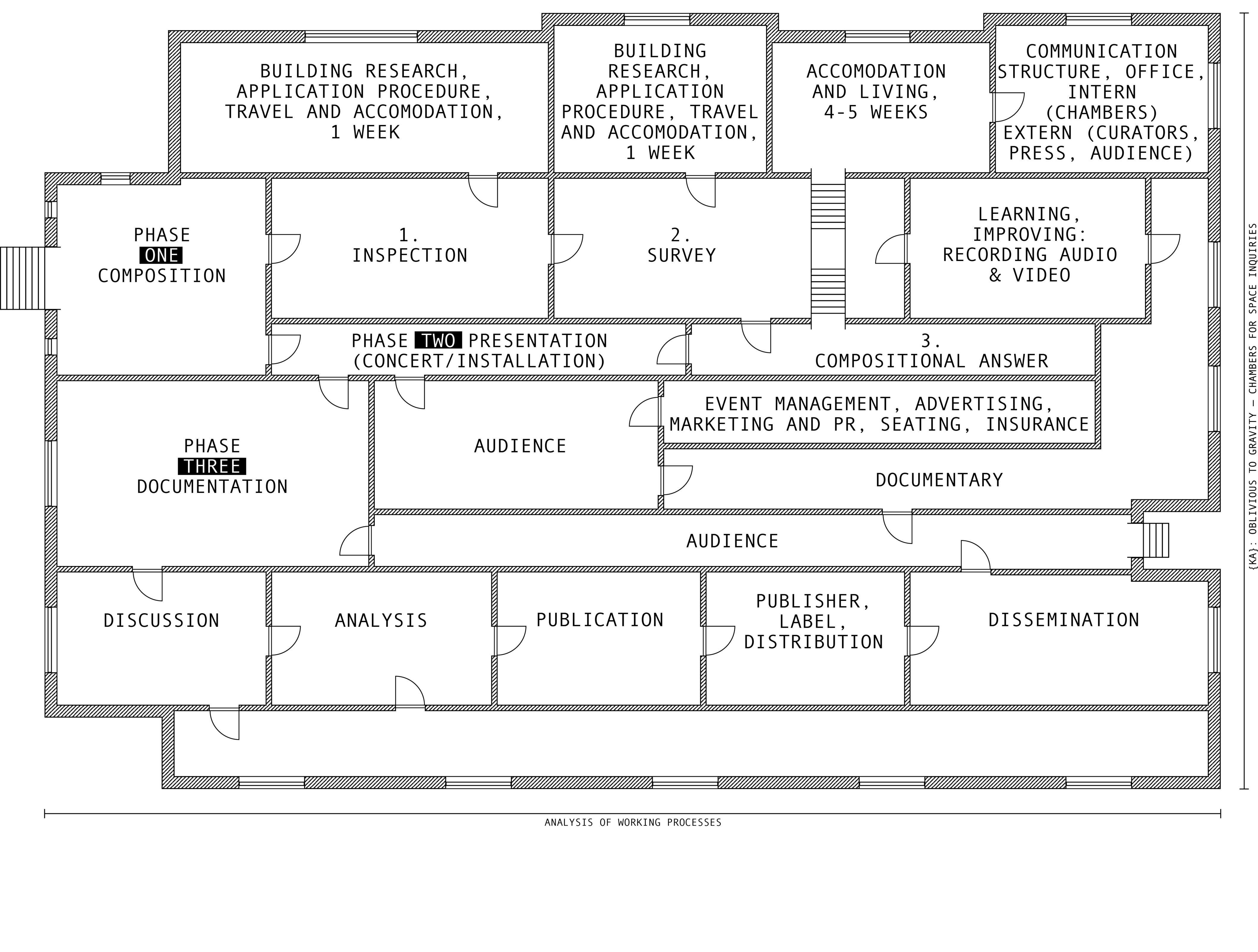 The members research, document, and reflect what kind of acoustic possibilities and sound qualities temporarily empty buildings can have and transform the results into a multi-part art project. Thereby the Chambers for Space Inquiries is a platform to control and realize this project and a point of departure to connect this project with other artistic and theoretical approaches.