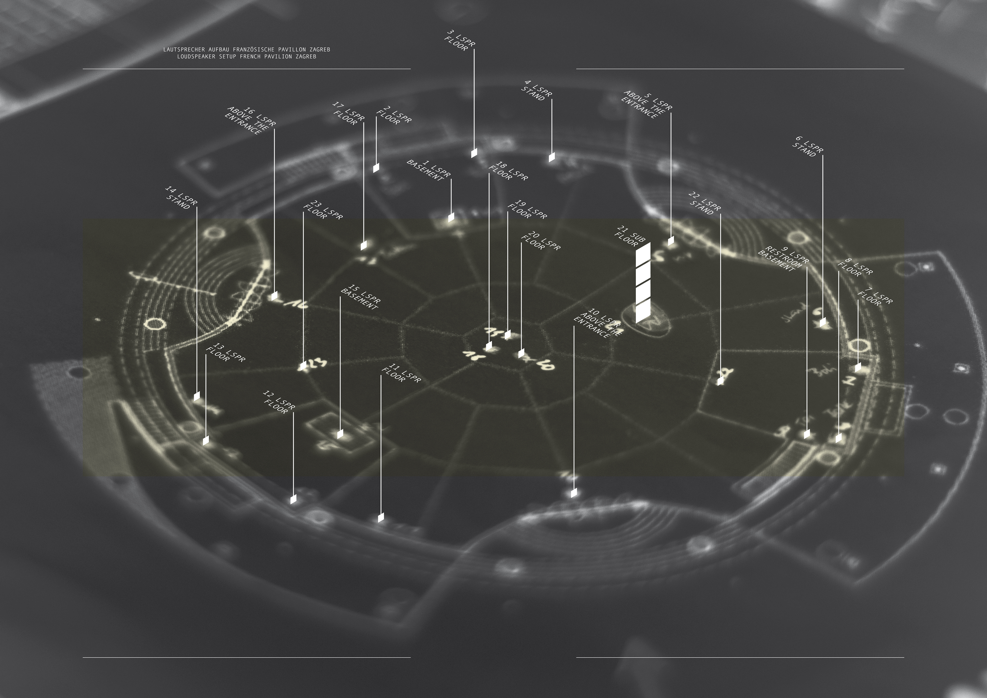 After days of detailed room surveys with the issit, I mounted three loudspeakers above the entrance doors with the help of a very shaky ladder at a height of eight meters each, erected a five-meter high tower of four subwoofers with the help of the theatre technicians and installed 22 more loudspeakers in the basement rooms (four), the toilets (two) and with tripods and supports at different heights and angles in the main hall.