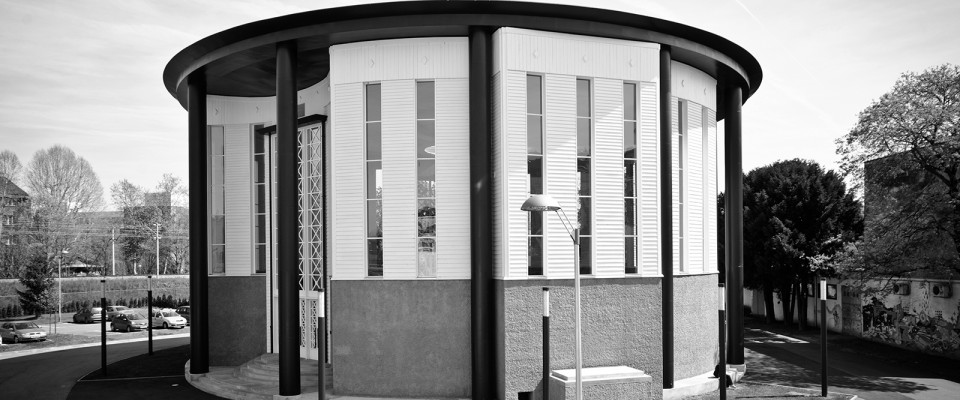 roof rests at the height of 13.50 m above ground on a ring-like series of 12 steel tubular columns 80 cm in diameter and 3 mm thick, fixed on short reinforced concrete bars that stick out from the concrete base. The roof structure is stretched under the weight of the central circular skylight which also functions as a precipitation collector, while the whole structure system is stabilized by a concrete ring beam in a steel tin box, laid directly on the columns. This masterpiece of modern architecture kept its original use as an exhibition space for the latest technical achievements for a very short time. In the Third Reich, the room was used as a holding point for Jewish citizens before deportation.