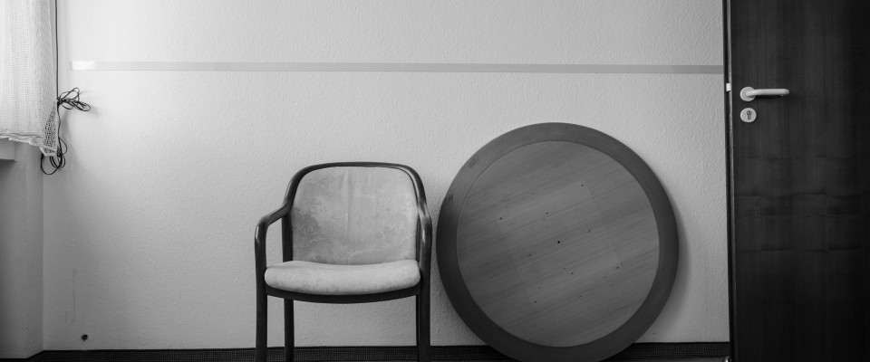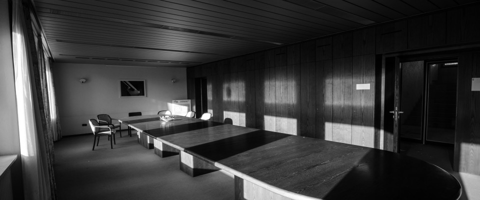 I remember the endless walks with recording devices, the long sitting in the individual rooms, chambers, and corridors, the pictures and stories that irresistibly appear when one passes by the left-over cupboards, tables, desks, a gigantic safe, the technical measuring devices for the collapsed site, copiers, telephone systems. There are shadows of people entering and leaving the cafeteria and terrace every day, the post office, and the underground heating plant. I remember the circular borehole that had been drilled through all the abandoned floors in the same place. About 20 cm in diameter. The undocumentable - as a yardstick - the disappearance of the documentation - next door.